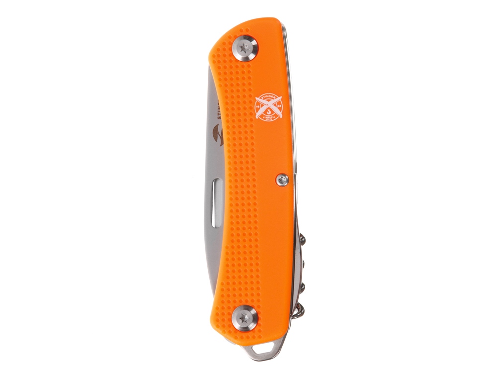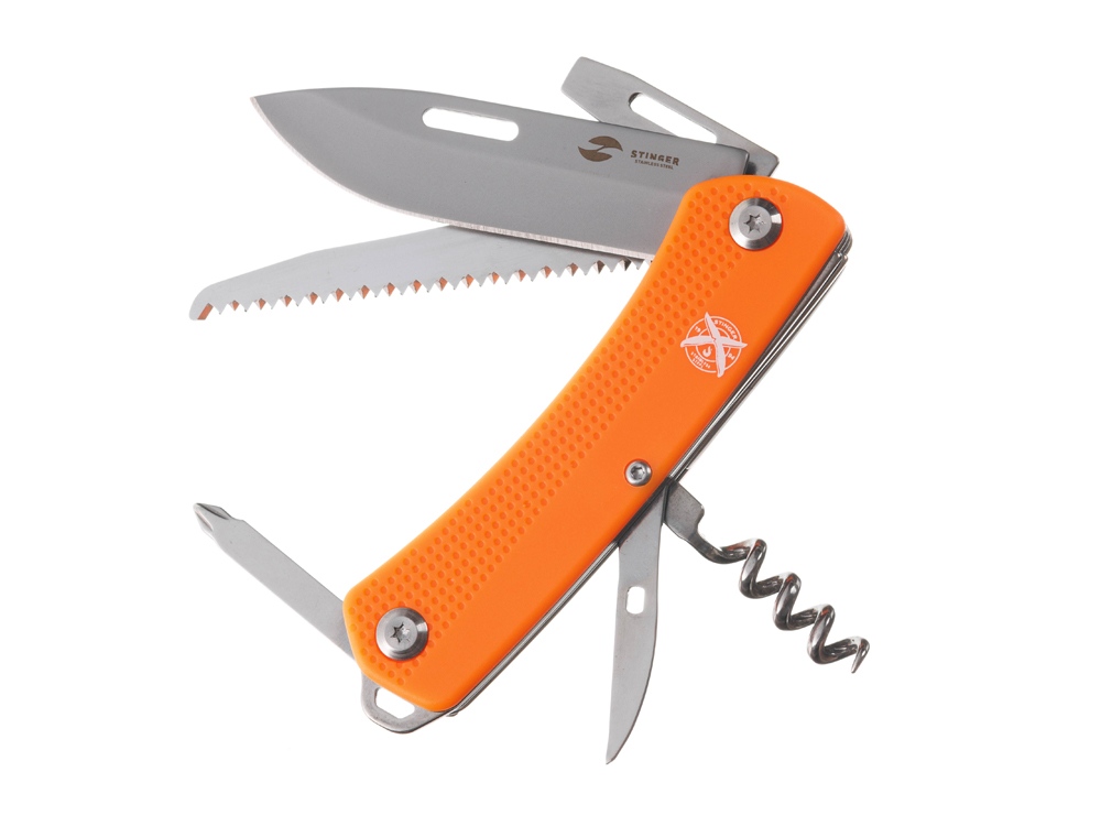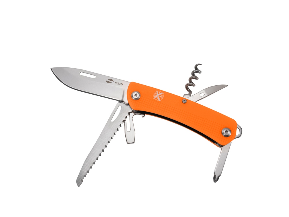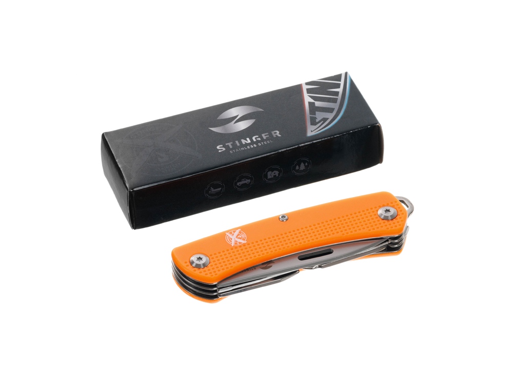 Нож перочинный STINGER имеет 10 функций: 1. Лезвие 2. Пила по дереву 3. Открывалка для бутылок с: 4. – Отверткой 5. – Инструментом для снятия изоляции 6. Штопор 7. Шило с: 8. – Иглой 9. Крестовая отвертка 10. Держатель для ключей ХАРАКТЕРИСТИКИ Материалы • лезвие/инструменты: нержавеющая сталь 440A, твердость 54-58 HRC • рукоять: нержавеющая сталь 440A, твердость 54-58 HRC • накладки рукояти: АБС-пластик Размеры • Размеры ножа: 103х28х19 мм • Общая длина: 175,5 мм • Длина клинка: 72,3 мм • Наибольшая ширина клинка: 19,7 мм • Толщина обуха: 2,2 мм • Длина рукояти: 103,2 мм • Ширина рукояти (в ср.части): 20,8 мм • Толщина рукояти (в ср.части): 15,8 мм Вес: 147 г Цвет накладок рукояти: оранжевый Накладки рукояти ножа не подлежат замене. Упаковка: картонная коробка