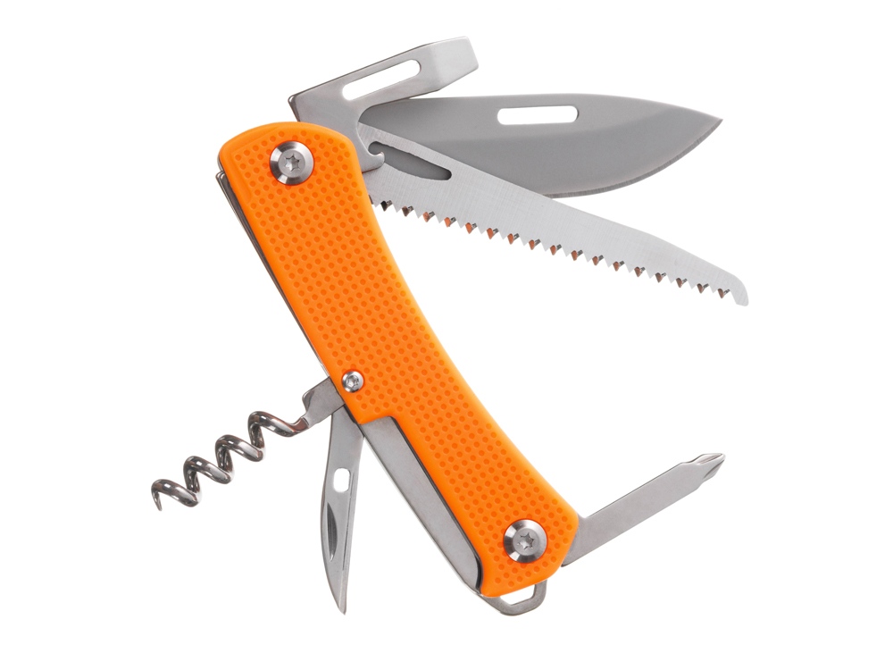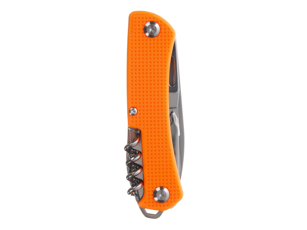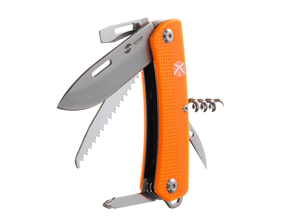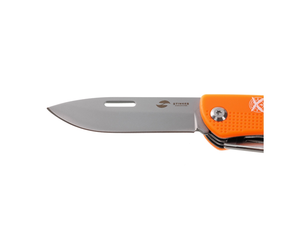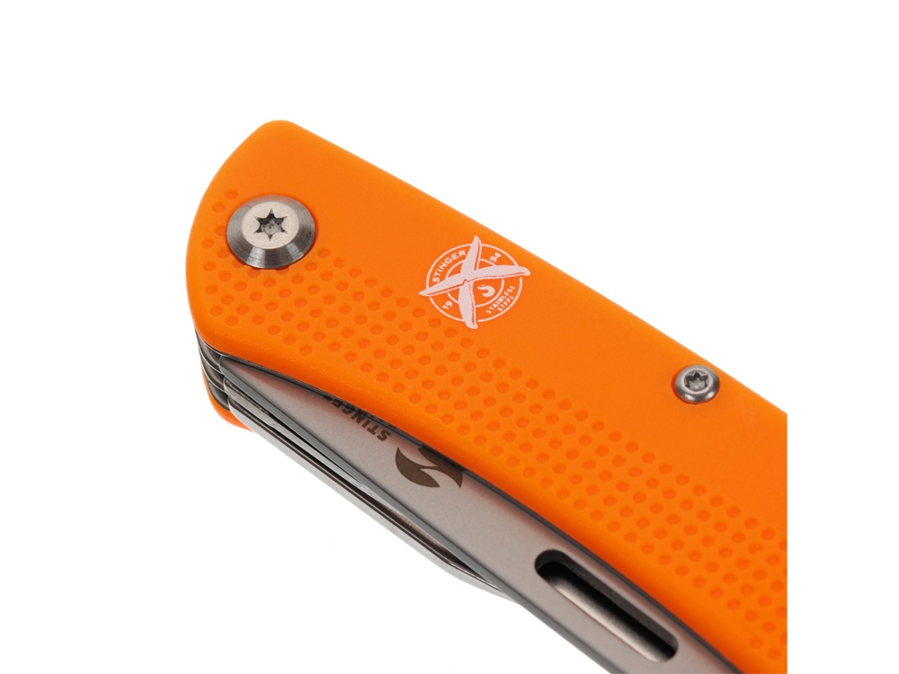 Нож перочинный STINGER имеет 10 функций: 1. Лезвие 2. Пила по дереву 3. Открывалка для бутылок с: 4. – Отверткой 5. – Инструментом для снятия изоляции 6. Штопор 7. Шило с: 8. – Иглой 9. Крестовая отвертка 10. Держатель для ключей ХАРАКТЕРИСТИКИ Материалы • лезвие/инструменты: нержавеющая сталь 440A, твердость 54-58 HRC • рукоять: нержавеющая сталь 440A, твердость 54-58 HRC • накладки рукояти: АБС-пластик Размеры • Размеры ножа: 103х28х19 мм • Общая длина: 175,5 мм • Длина клинка: 72,3 мм • Наибольшая ширина клинка: 19,7 мм • Толщина обуха: 2,2 мм • Длина рукояти: 103,2 мм • Ширина рукояти (в ср.части): 20,8 мм • Толщина рукояти (в ср.части): 15,8 мм Вес: 147 г Цвет накладок рукояти: оранжевый Накладки рукояти ножа не подлежат замене. Упаковка: картонная коробка
