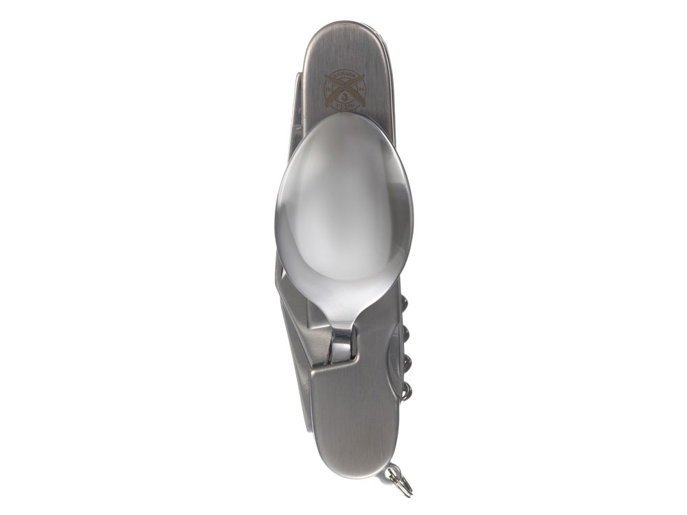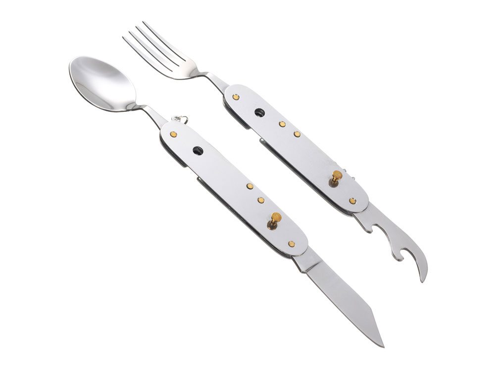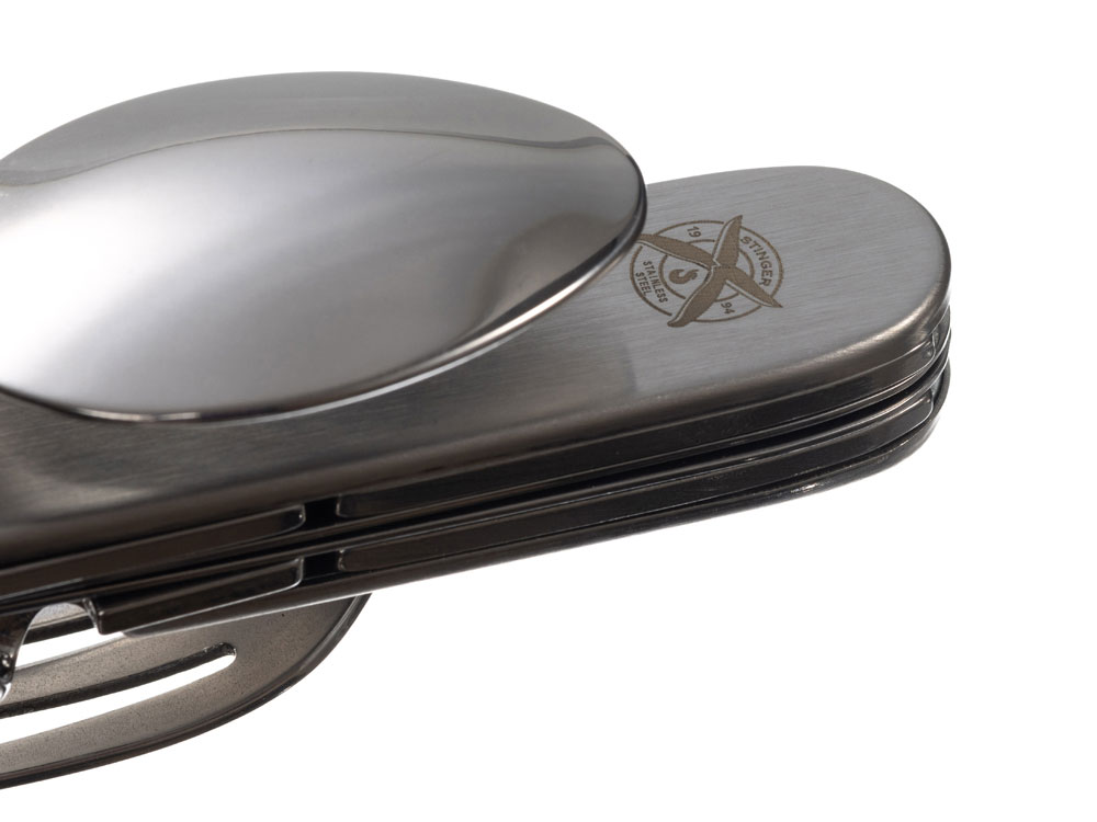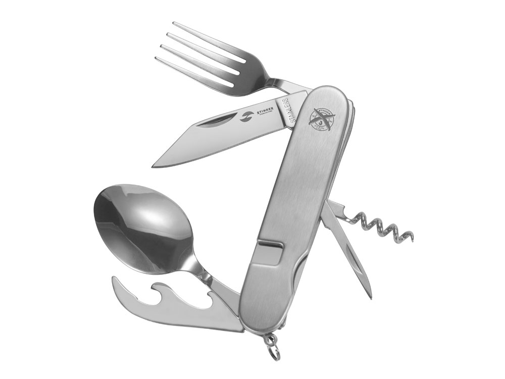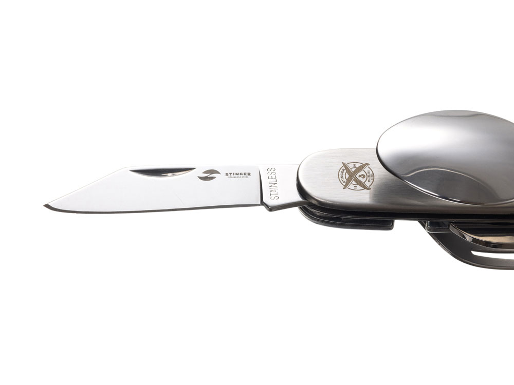 Нож перочинный STINGER имеет 8 функций: 1. Лезвие 2. Ложка 3. Вилка 4. Открывалка для бутылок 5. Консервный нож 6. Ледокол 7. Штопор 8. Кольцо для ключей ХАРАКТЕРИСТИКИ: Материалы: • лезвие/инструменты: нержавеющая сталь AISI 420, твердость 44-48 HRC • рукоять: нержавеющая сталь AISI 420, твердость 44-48 HRC • накладки рукояти: нержавеющая сталь AISI 420, твердость 44-48 HRC Размер: 109 мм Вес: 146 г Цвет накладок рукояти: серебристый Накладки рукояти ножа не подлежат замене. Нож нельзя мыть в посудомоечной машине. Упаковка: картонная коробка Нож разборный, состоит из двух частей. Разборка: разогнуть вилку и ложку, разделить на 2 части.