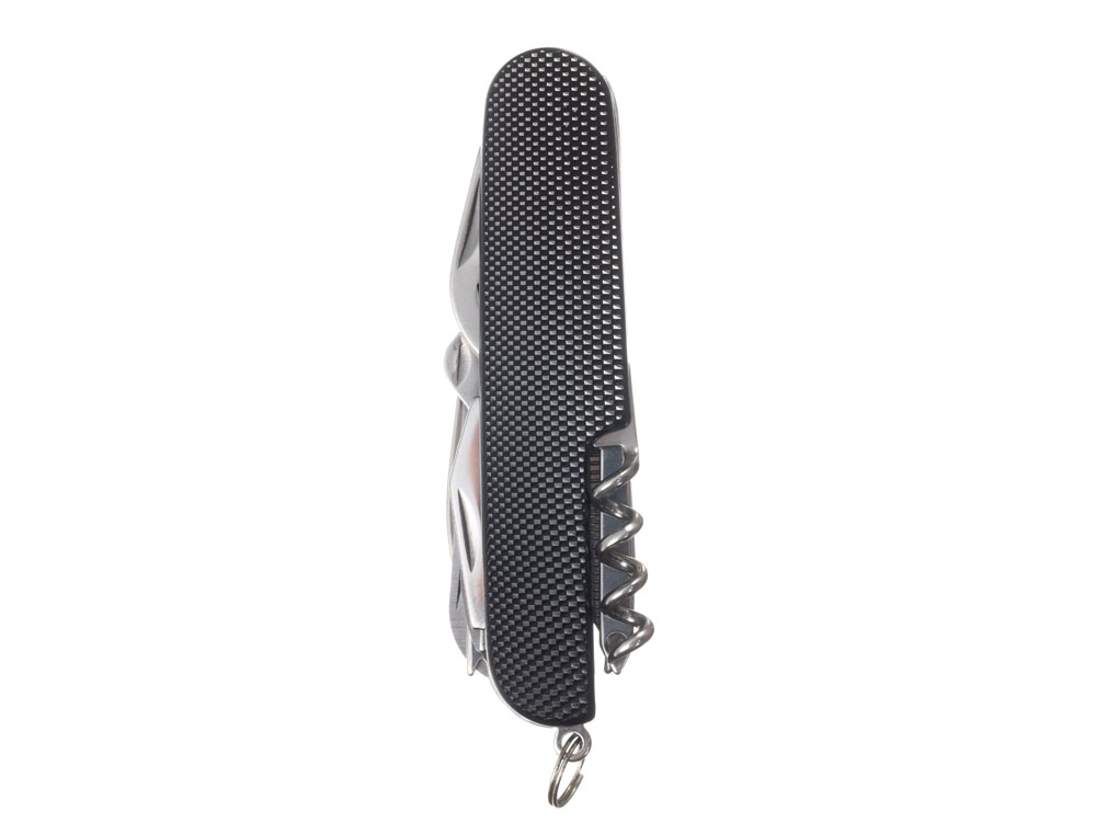 Нож перочинный STINGER имеет 15 функций: 1. Большое лезвие 2. Пила по дереву 3. Инструмент для чистки рыбы с: 4. - Инструментом для извлечения рыболовного крючка 5. Ножницы 6. Консервный нож 7. Открывалка для бутылок с: 8. - Отверткой 9. Крестовая отвертка 10. Ледокол 11. Пилка для ногтей с: 12. - Инструментом по уходу за ногтями 13. Игла 14. Штопор 15. Кольцо для ключей ХАРАКТЕРИСТИКИ Материалы: • лезвие/инструменты: нержавеющая сталь AISI 420, твердость 44-48 HRC • рукоять: нержавеющая сталь AISI 420, твердость 44-48 HRC • накладки рукояти: алюминий Размер: 89 мм Вес: 110 г Цвет накладок рукояти: черный Накладки рукояти ножа не подлежат замене. Упаковка: картонная коробка