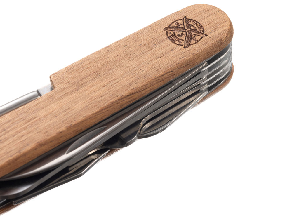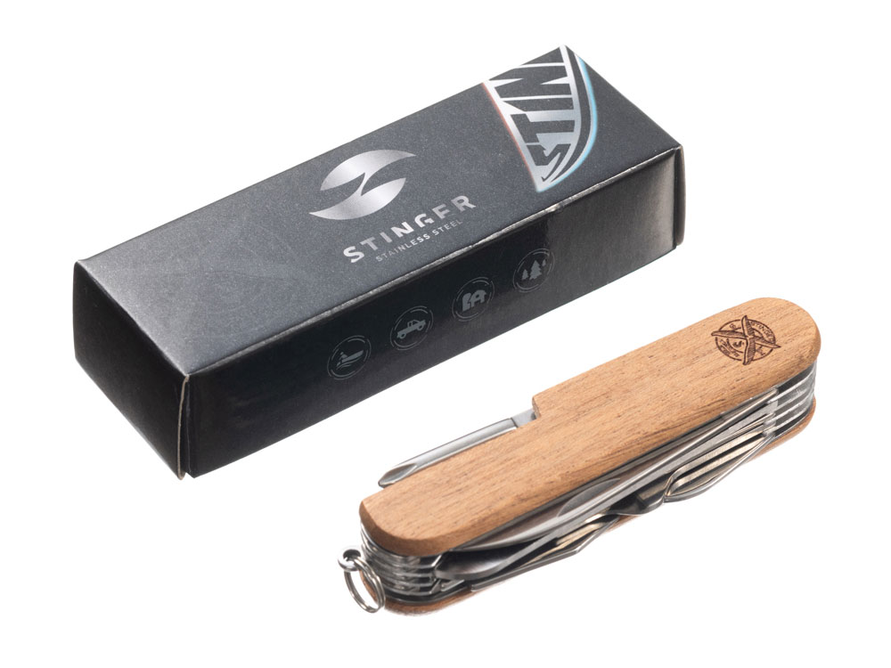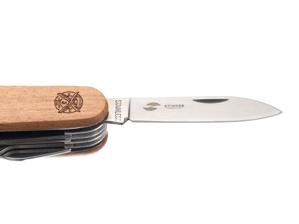 Нож перочинный STINGER имеет 15 функций: 1. Большое лезвие 2. Пила по дереву 3. Инструмент для чистки рыбы с: 4. - Инструментом для извлечения рыболовного крючка 5. Ножницы 6. Консервный нож 7. Открывалка для бутылок с: 8. - Отверткой 9. Крестовая отвертка 10. Ледокол 11. Пилка для ногтей с: 12. - Инструментом по уходу за ногтями 13. Игла 14. Штопор 15. Кольцо для ключей ХАРАКТЕРИСТИКИ Материалы • лезвие/инструменты: нержавеющая сталь 420, твердость 44-48 HRC • рукоять: нержавеющая сталь 420, твердость 44-48 HRC • накладки рукояти: древесина сапеле (энтандрофрагма цилиндрическая) Накладки рукояти ножа не подлежат замене.