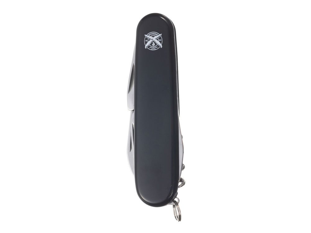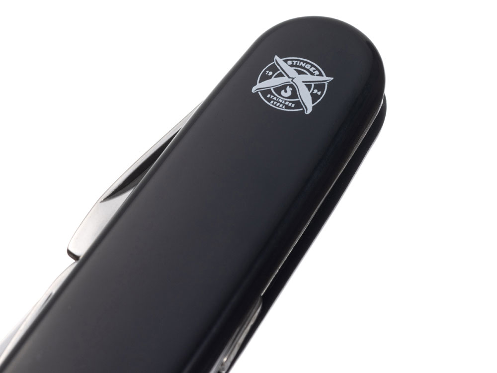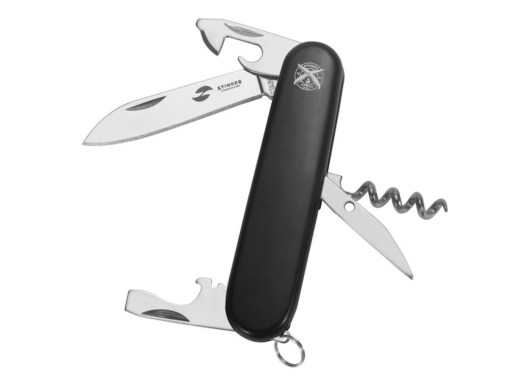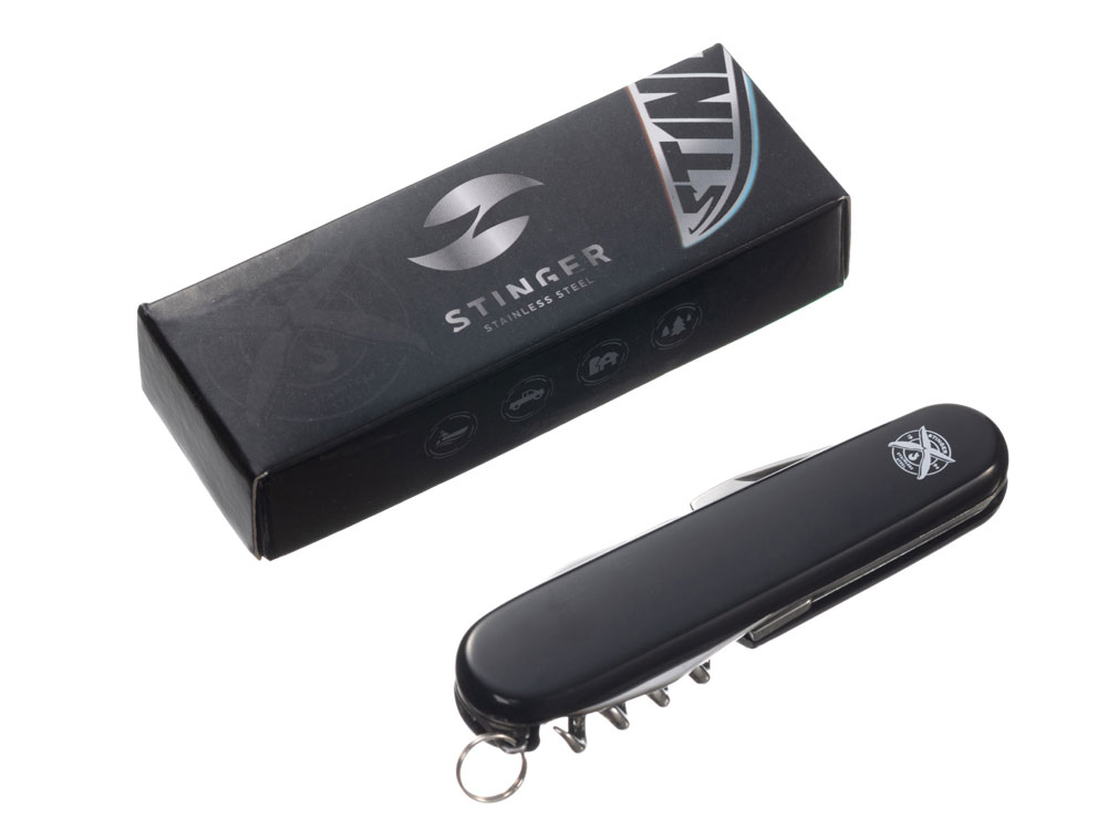 Нож перочинный STINGER имеет 10 функций: 1. Большое лезвие 2. Консервный нож с: 3. – Малой отвёрткой 4. Шило с: 5. – Иглой 6. Штопор 7. Открывалка для бутылок с: 8. – Отвёрткой 9. – Инструментом для снятия изоляции 10. Кольцо для ключей ХАРАКТЕРИСТИКИ Материалы: • лезвие/инструменты: нержавеющая сталь AISI 420, твердость 44-48 HRC • рукоять: нержавеющая сталь AISI 420, твердость 44-48 HRC • накладки рукояти: АБС-пластик Размер: 90 мм Вес: 63 г Цвет накладок рукояти: черный Накладки рукояти ножа не подлежат замене. Упаковка: картонная коробка