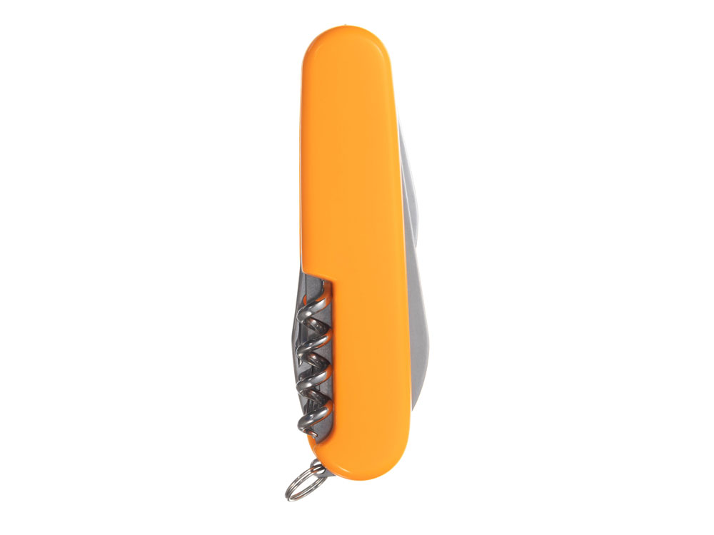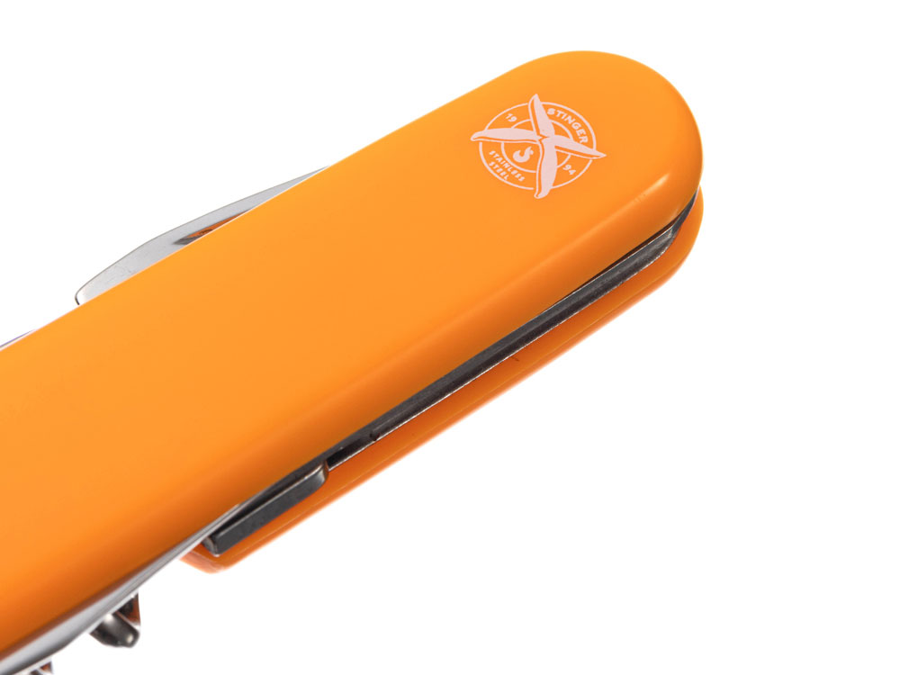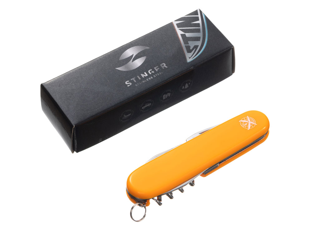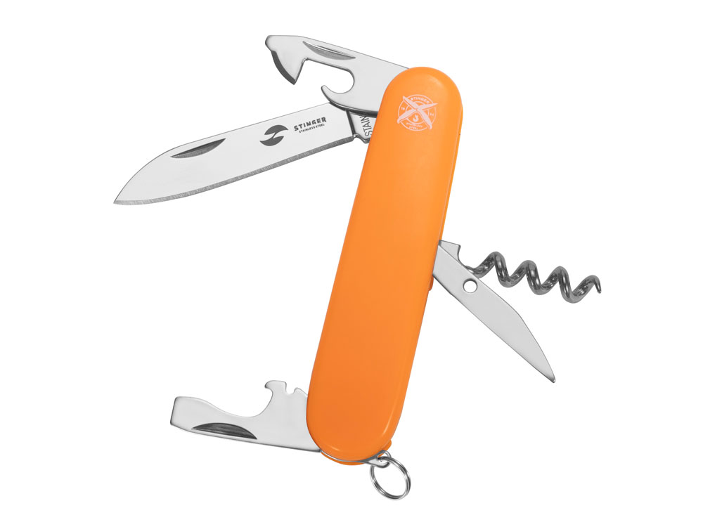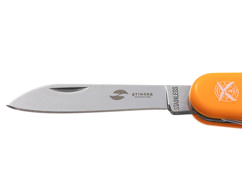Нож перочинный STINGER имеет 10 функций: 1. Большое лезвие 2. Консервный нож с: 3. – Малой отвёрткой 4. Шило с: 5. – Иглой 6. Штопор 7. Открывалка для бутылок с: 8. – Отвёрткой 9. – Инструментом для снятия изоляции 10. Кольцо для ключей ХАРАКТЕРИСТИКИ Материалы: • лезвие/инструменты: нержавеющая сталь AISI 420, твердость 44-48 HRC • рукоять: нержавеющая сталь AISI 420, твердость 44-48 HRC • накладки рукояти: АБС-пластик Размер: 90 мм Вес: 63 г Цвет накладок рукояти: оранжевый Накладки рукояти ножа не подлежат замене. Упаковка: картонная коробка