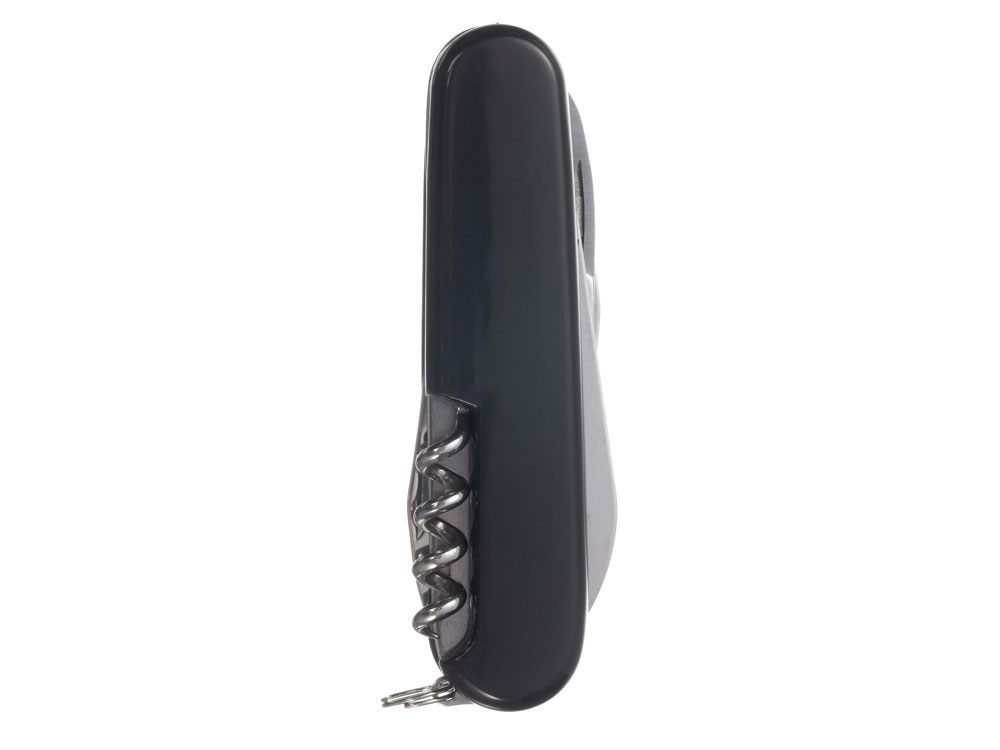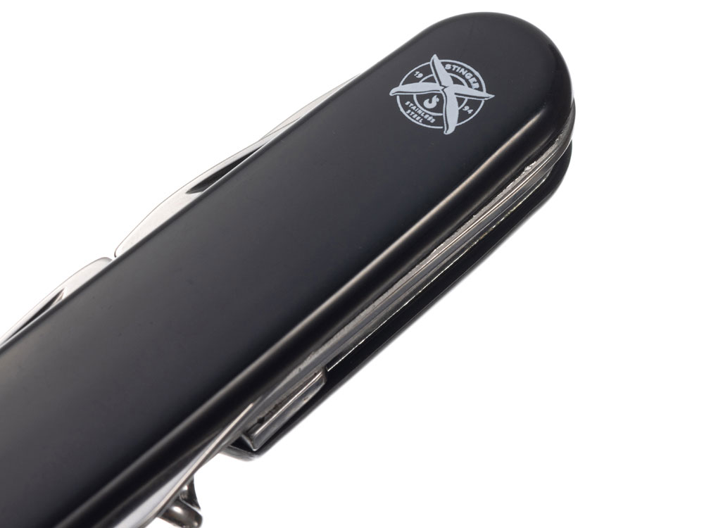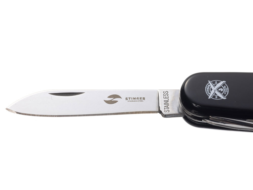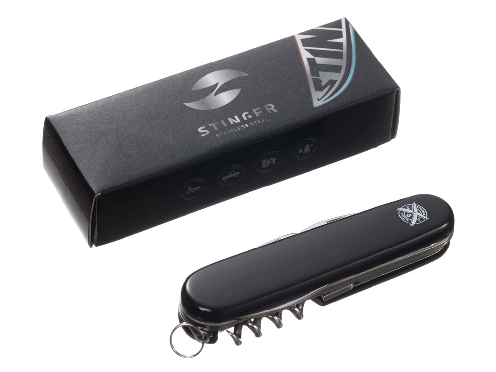 Нож перочинный STINGER имеет 11 функций: 1. Большое лезвие 2. Консервный нож с: 3. – Малой отвёрткой 4. Шило с: 5. – Иглой 6. Открывалка для бутылок с: 7. – Отвёрткой 8. – Инструментом для снятия изоляции 9. Ножницы 10. Штопор 11. Кольцо для ключей ХАРАКТЕРИСТИКИ Материалы: • лезвие/инструменты: нержавеющая сталь AISI 420, твердость 44-48 HRC • рукоять: нержавеющая сталь AISI 420, твердость 44-48 HRC • накладки рукояти: АБС-пластик Размер: 90 мм Вес: 69 г Цвет накладок рукояти: черный Накладки рукояти ножа не подлежат замене. Упаковка: картонная коробка