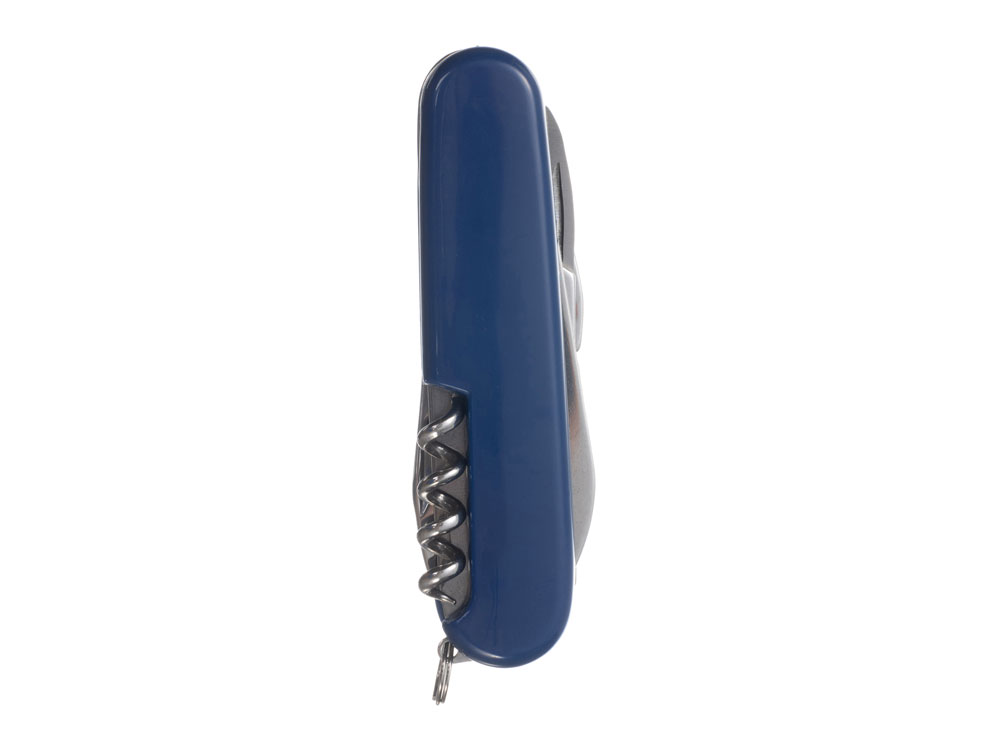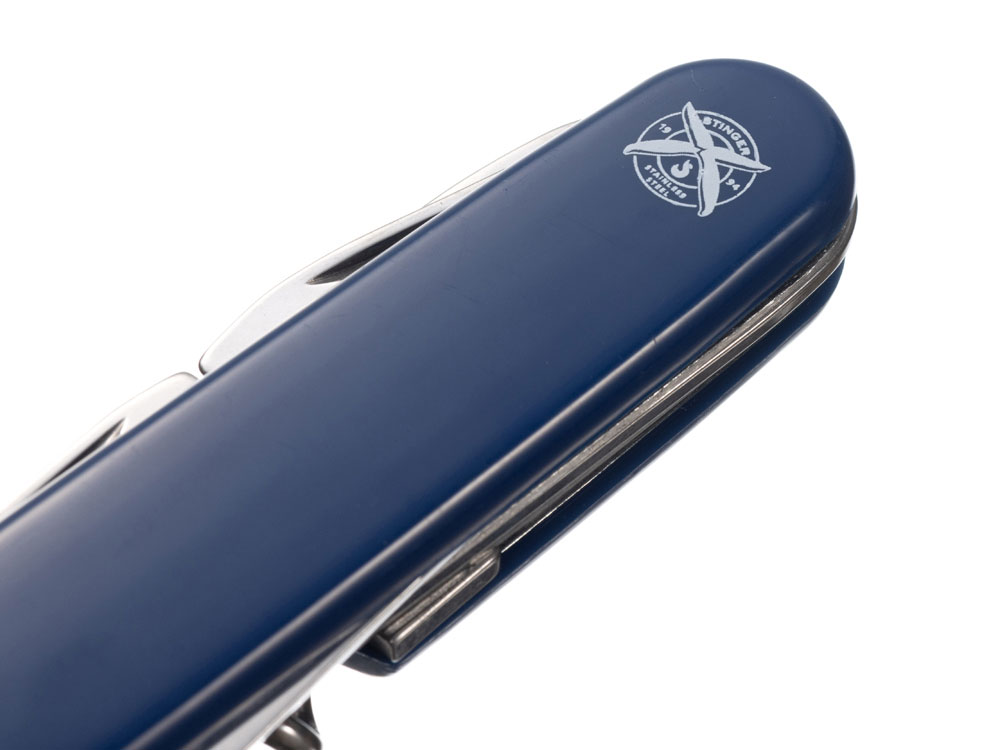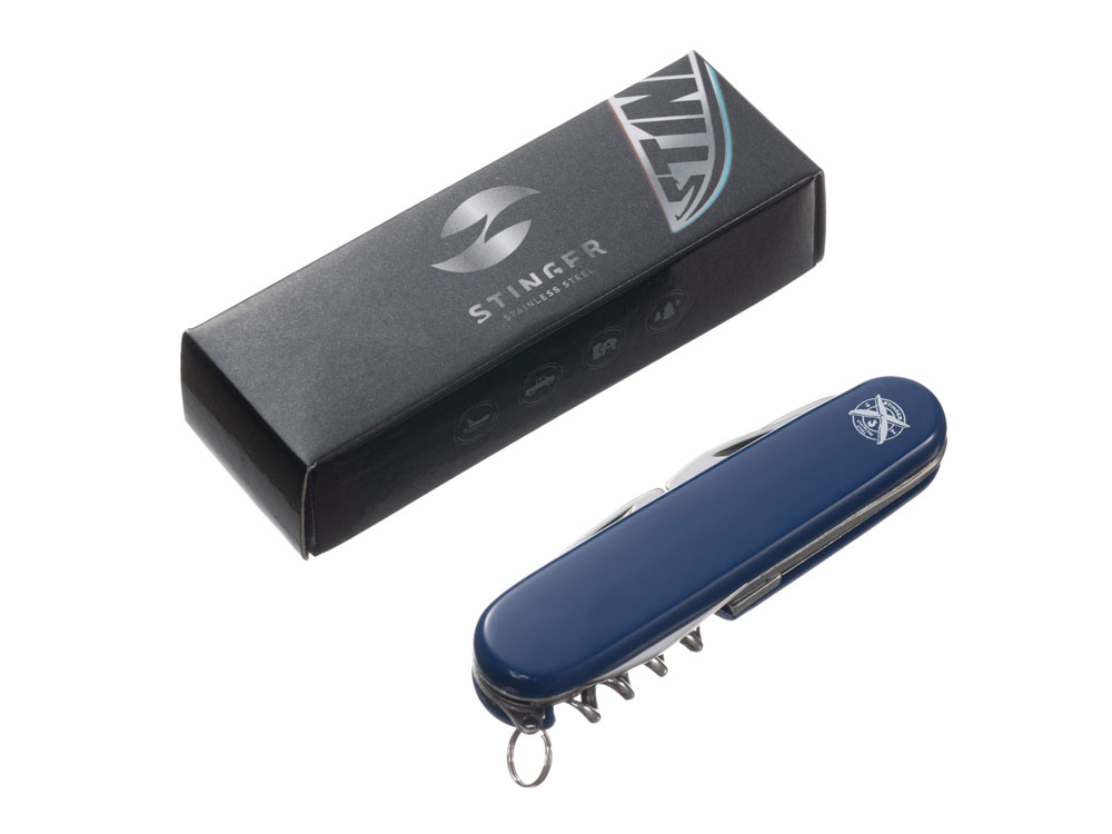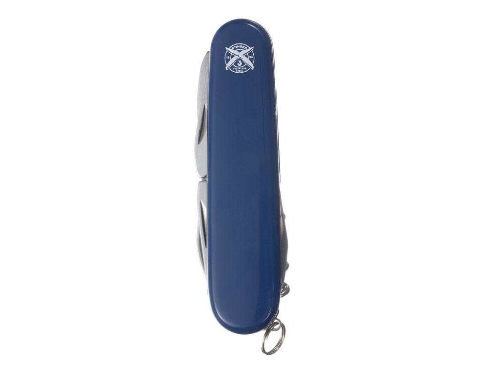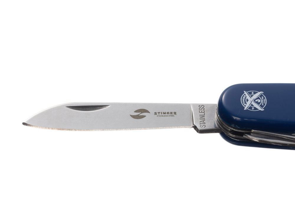 Нож перочинный STINGER имеет 11 функций: 1. Большое лезвие 2. Консервный нож с: 3. – Малой отвёрткой 4. Шило с: 5. – Иглой 6. Открывалка для бутылок с: 7. – Отвёрткой 8. – Инструментом для снятия изоляции 9. Ножницы 10. Штопор 11. Кольцо для ключей ХАРАКТЕРИСТИКИ Материалы: • лезвие/инструменты: нержавеющая сталь AISI 420, твердость 44-48 HRC • рукоять: нержавеющая сталь AISI 420, твердость 44-48 HRC • накладки рукояти: АБС-пластик Размер: 90 мм Вес: 69 г Цвет накладок рукояти: синий Накладки рукояти ножа не подлежат замене. Упаковка: картонная коробка