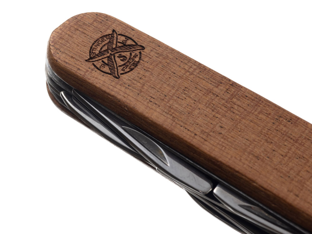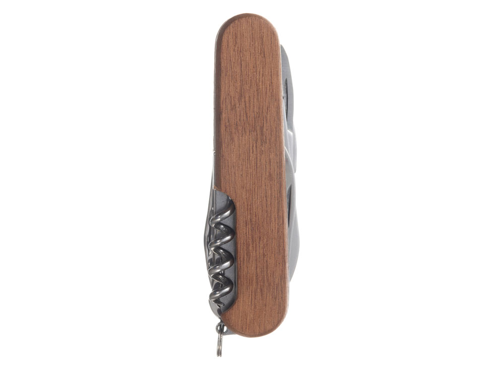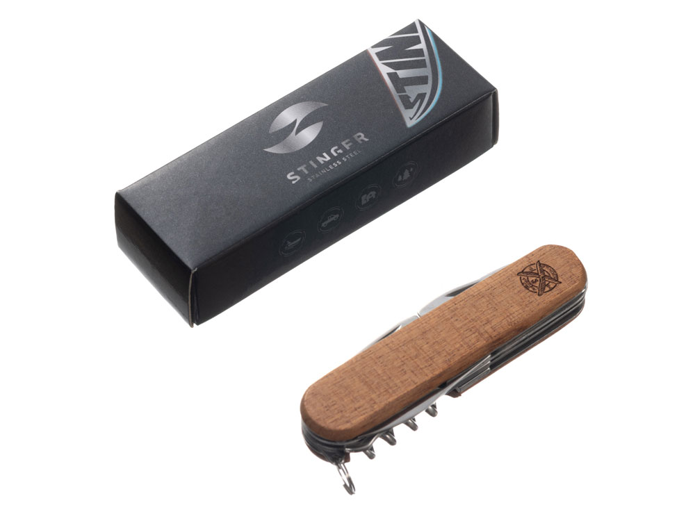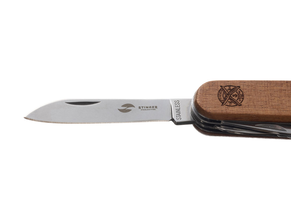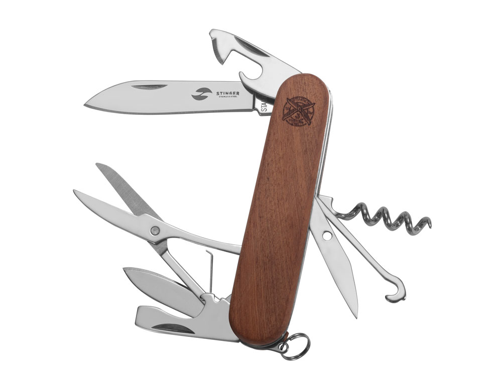 Нож перочинный STINGER имеет 13 функций: 1. Большое лезвие 2. Консервный нож с: 3. – Малой отвёрткой 4. Малое лезвие 5. Открывалка для бутылок с: 6. – Отвёрткой 7. – Инструментом для снятия изоляции 8. Ножницы 9. Многофункциональный крючок 10. Штопор 11. Шило с: 12. – Иглой 13. Кольцо для ключей ХАРАКТЕРИСТИКИ Материалы: • лезвие/инструменты: нержавеющая сталь AISI 420, твердость 44-48 HRC • рукоять: нержавеющая сталь AISI 420, твердость 44-48 HRC • накладки рукояти: древесина сапеле (энтандрофрагма цилиндрическая) Размер: 90 мм Вес: 114 г Цвет накладок рукояти: коричневый Накладки рукояти ножа не подлежат замене. Упаковка: картонная коробка