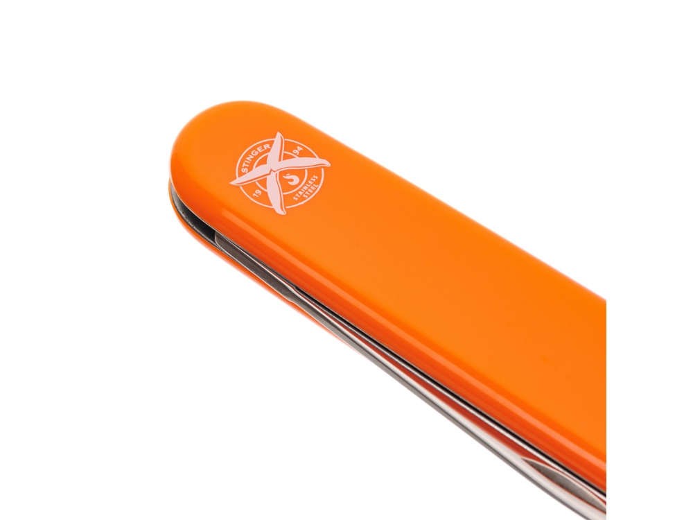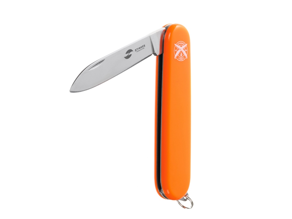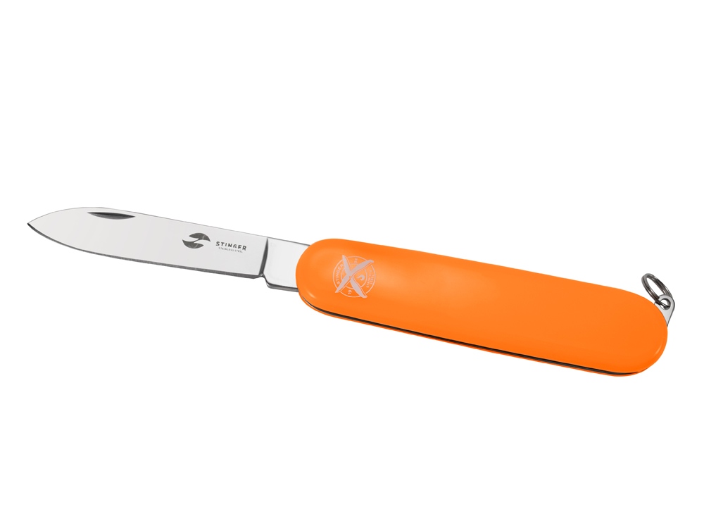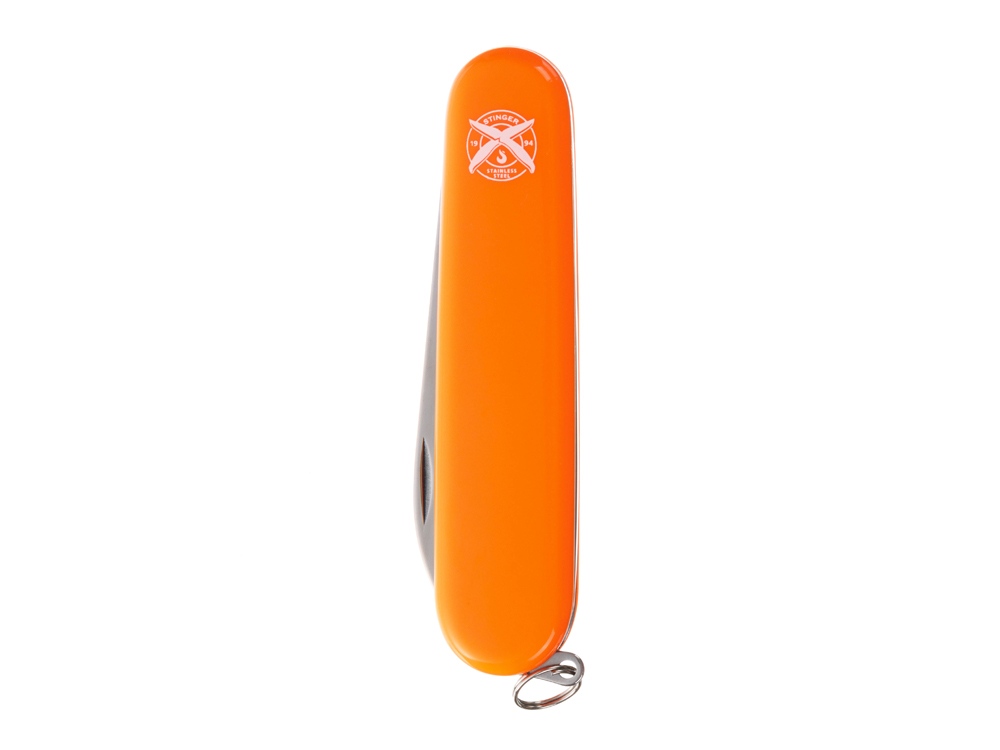 Нож перочинный STINGER имеет 2 функции: 1. Лезвие 2. Кольцо для ключей ХАРАКТЕРИСТИКИ Материалы • лезвие/инструменты: нержавеющая сталь 420, твердость 44-48 HRC • рукоять: нержавеющая сталь 420, твердость 44-48 HRC • накладки рукояти: АБС-пластик Размеры • Размеры ножа: 90х26,5х14 мм • Общая длина: 160,1 мм • Длина клинка: 67,5 мм • Наибольшая ширина клинка: 12,3 мм • Толщина обуха: 2,5 мм • Длина рукояти: 92,6 мм • Ширина рукояти (в ср.части): 20,3 мм • Толщина рукояти (в ср.части): 12,1 мм Вес: 50 г Цвет накладок рукояти: оранжевый Накладки рукояти ножа не подлежат замене. Упаковка: картонная коробка