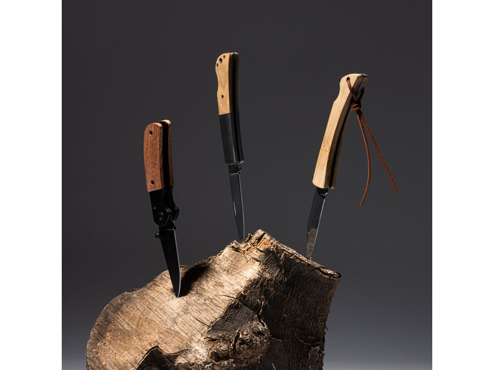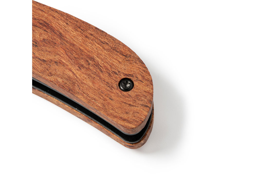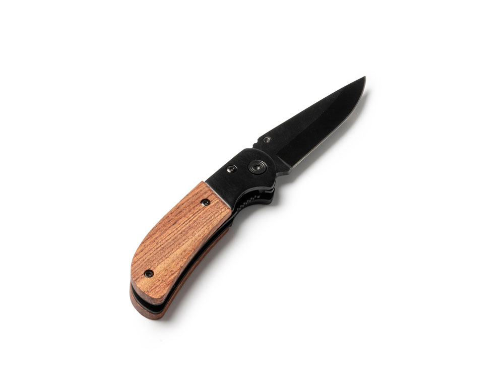 Нож из нержавеющей стали с черным лезвием и рукояткой из натуральной древесины. Идеальный нож для похода. Нож оснащен системой безопасности.