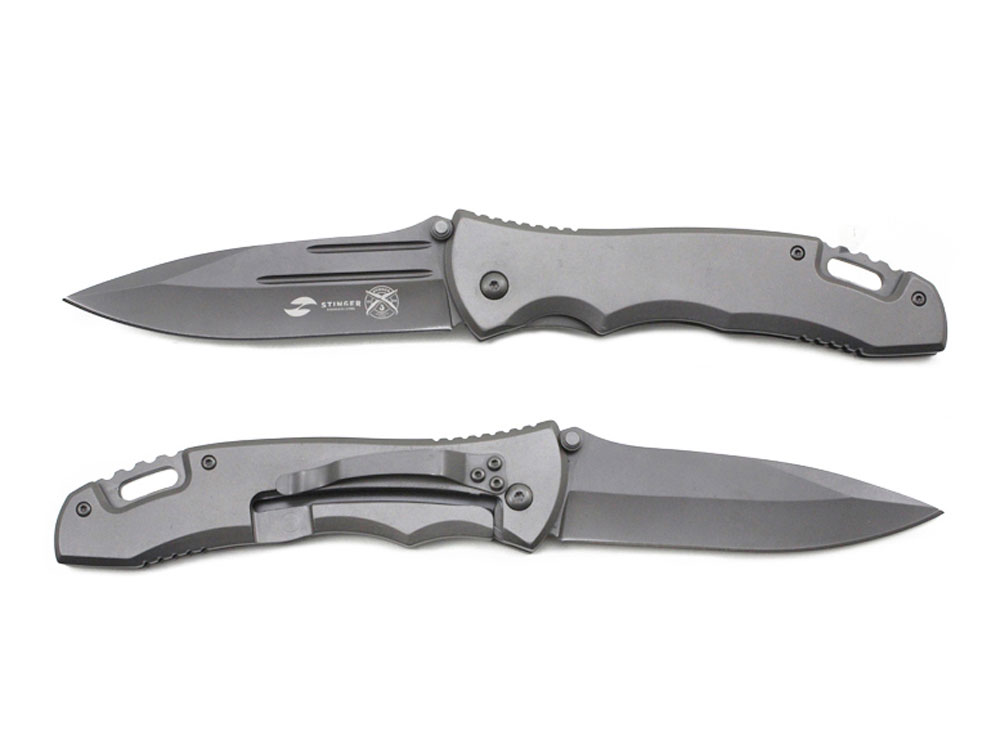 НОЖ СКЛАДНОЙ STINGER Материал лезвия: нержавеющая сталь марки 420 Материал рукояти: нержавеющая сталь Фиксатор лезвия: Liner Lock Длина ножа: 235 мм Длина клинка: 102 мм Толщина клинка: 3 мм Вес: 236 г Цвет рукояти: серый Особенности: с клипом и отверстием под темляк Метод открывания клинка: шпенёк (подпальцевый упор на лезвии)