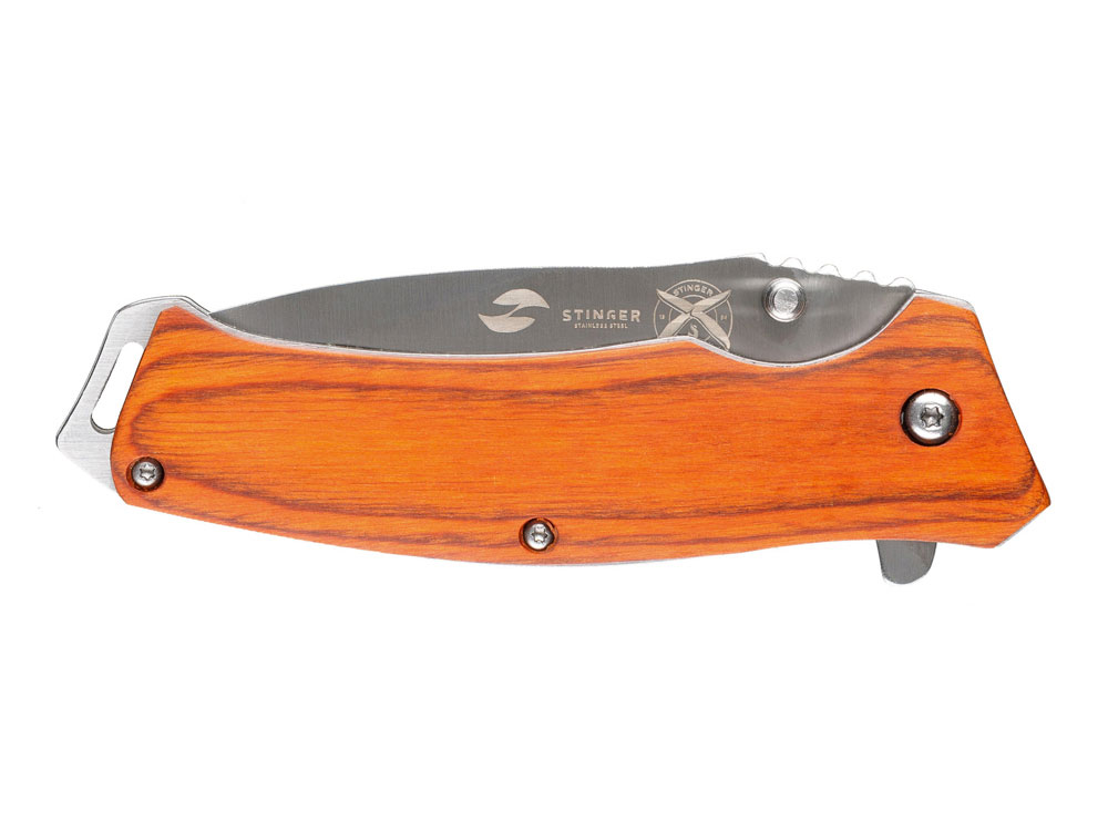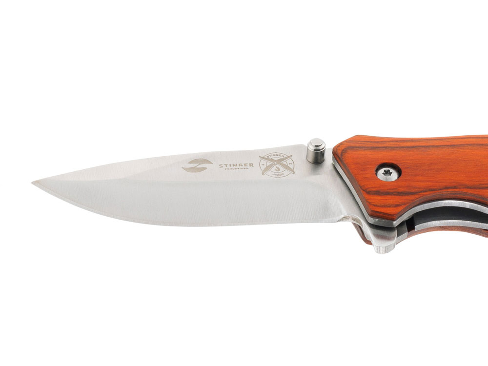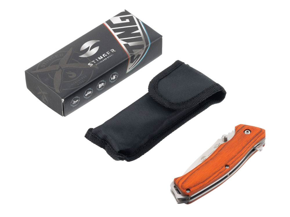 НОЖ СКЛАДНОЙ STINGER Материал лезвия: нержавеющая сталь Материал рукояти: сталь + дерево Фиксатор лезвия: Liner Lock Длина ножа: 190 мм Длина клинка: 80 мм Толщина клинка: 3 мм Вес: 132 г Цвет рукояти: коричневый Особенности: рукоять с отверстием под темляк Метод открывания клинка: шпенёк (подпальцевый упор на лезвии) В комплекте: нейлоновый чехол