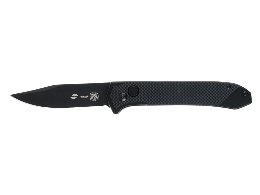 НОЖ СКЛАДНОЙ STINGER Автоматический складной нож из высококачественных материалов, идеально подойдет для повседневного использования. Рукоять ножа изготовлена из нержавеющей стали с накладками из стеклотекстолита G10 - композитного материала на основе стеклоткани и эпоксидной смолы. G10 является прочным и ударостойким материалом, отлично переносит влагу, отличается повышенной стойкостью к огню. Рукоять ножа собрана на втулках - бонках, поэтому при необходимости его можно легко промыть. На рукояти расположена съемная клипса для удобного размещения ножа в кармане. Нож легко открывается и надежно фиксируется благодаря замку Button Lock. Клинок изготовлен из нержавеющей стали 8CR14MoV. Основное преимущество этой стали - отличное противодействие коррозии благодаря высокому содержанию хрома (14,5%). Сталь 8CR14MoV относится к высокоуглеродистым сталям (0,8%), углерод в составе придает сплаву твердость в диапазоне 57-59 HRC, что позволяет режущей кромке лезвия длительное время оставаться острой. Оптимальное содержание легирующих элементов придает стали гибкость, лезвие хорошо поддается правке и заточке. Клинок из стали 8CR14MoV отличается высокой прочностью и устойчивостью к износу, имеет долгий срок службы, обеспечивает качественный и точный срез. Характеристики: Материал клинка: нержавеющая сталь 8CR14MoV Твердость по шкале Роквелла: 57-59 HRC Материал рукояти: нержавеющая сталь/стеклотекстолит G10 Метод открывания клинка: автомат Фиксатор клинка: Button Lock Длина ножа: 195 мм Длина клинка: 80 мм Толщина клинка: 3,5 мм Вес: 130 г Цвет рукояти: черный Особенности: рукоять с клипом В комплекте: нейлоновый чехол