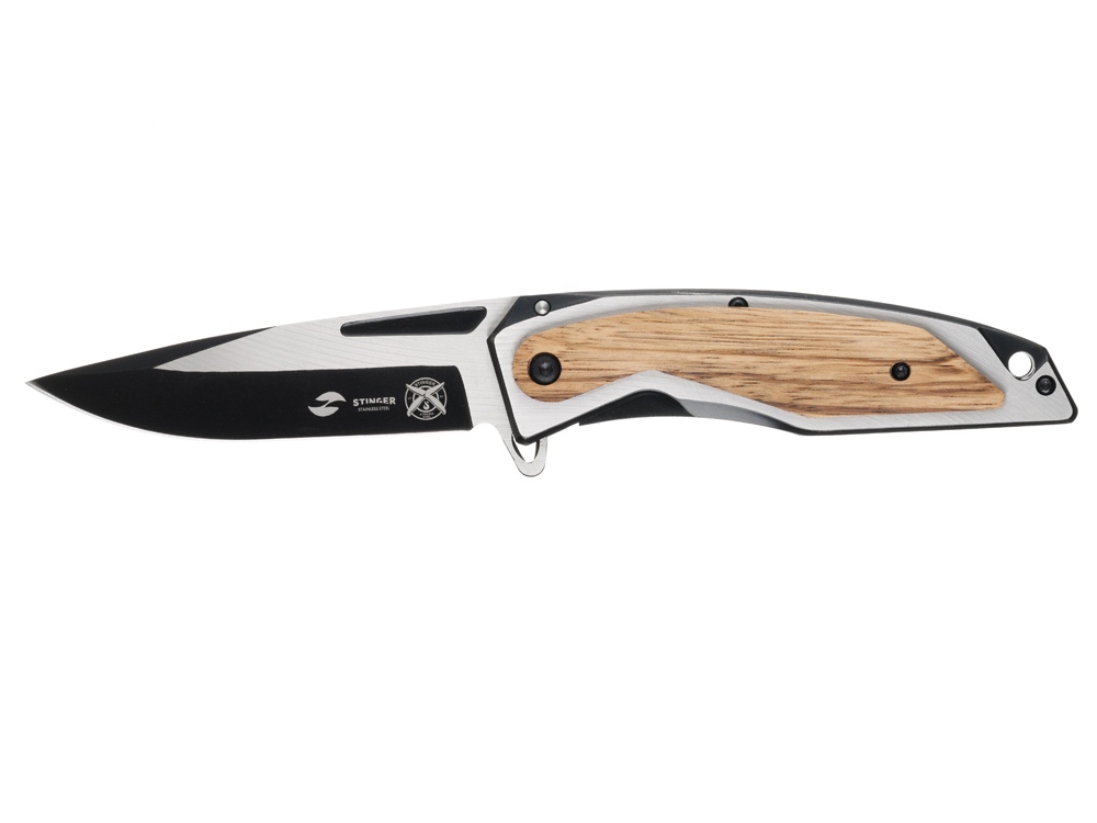 НОЖ СКЛАДНОЙ STINGER Повседневный нож для широкого спектра задач. Легкий и неприхотливый в обслуживании. Рукоять ножа произведена из нержавеющей стали с накладками из древесины, собрана на втулках - бонках, поэтому при необходимости нож можно легко промыть. Нож быстро открывается при помощи флиппера с ассистом (механизм ускоренного открывания). На рукояти расположено отверстие для темляка и клипса для удобного размещения ножа в кармане. Клинок ножа произведен из жаропрочной мартенситной стали 3Cr13. Преимуществом этой стали является отличное противодействие коррозии благодаря высокому содержанию хрома (13%). Оптимальное содержание легирующих элементов в составе сплава 3Cr13 придает ему хорошую твердость в диапазоне 52-55 HRC. Из-за низкого содержания углерода (0,3%) заточку лезвие из такой сталь держит средне, но легко затачивается даже после активной эксплуатации ножа. При этом дополнительных аксессуаров для заточки не требуется, достаточно простого точильного камня или мусата. Характеристики: Материал клинка: нержавеющая сталь 3CR13 Твердость по шкале Роквелла: 52-55 HRC Материал рукояти: нержавеющая сталь/древесина зебрано Метод открывания клинка: флиппер с ассистом (механизм ускоренного открывания) Фиксатор клинка: Liner Lock Длина ножа: 215 мм Длина клинка: 95 мм Толщина клинка: 3 мм Вес: 146 г. Цвет рукояти: коричневый/серебристый Особенности: рукоять с клипом и отверстием под темляк В комплекте: нейлоновый чехол
