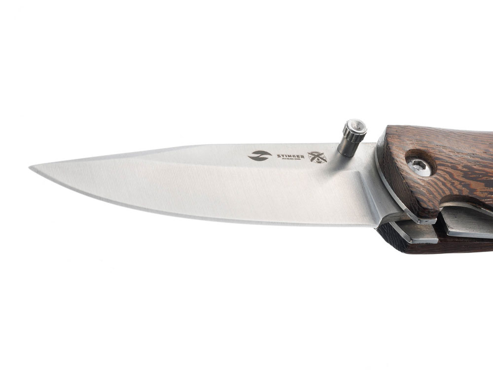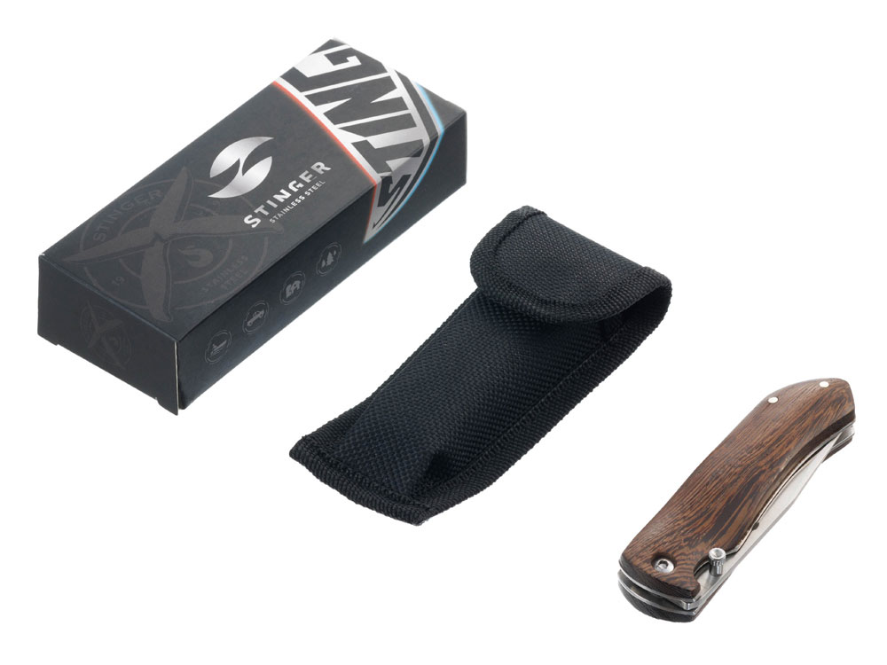 НОЖ СКЛАДНОЙ STINGER Материал лезвия: нержавеющая сталь марки 420 Материал рукояти: древесина венге Фиксатор лезвия: Liner Lock Длина ножа: 190 мм Длина клинка: 77 мм Толщина клинка: 3 мм Вес: 120 г Цвет рукояти: коричневый Метод открывания клинка: шпенёк (подпальцевый упор на лезвии) В комплекте: нейлоновый чехол