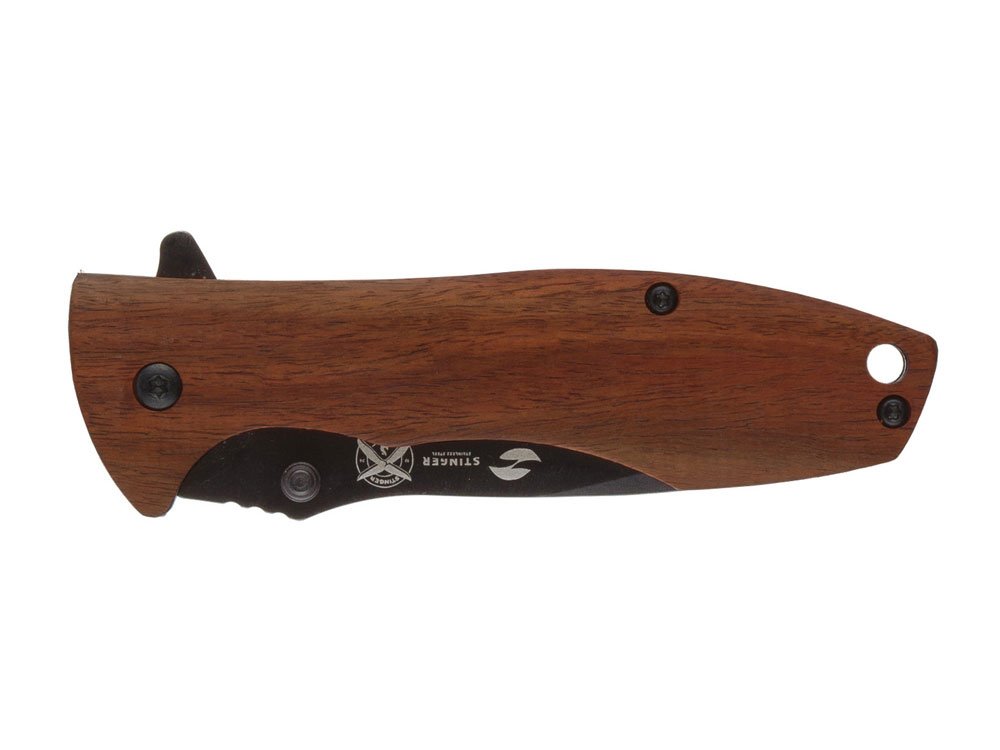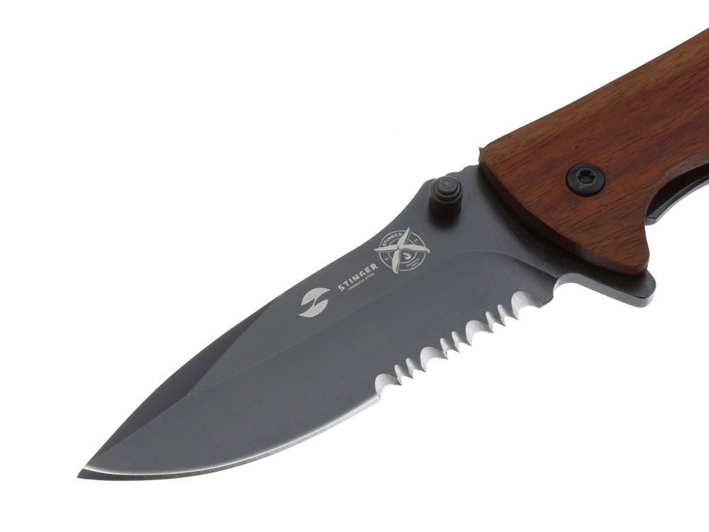НОЖ СКЛАДНОЙ STINGER Материал лезвия: нержавеющая сталь марки 3Cr13 Материал рукояти: сталь + сандаловое дерево Фиксатор лезвия: Frame Lock Длина ножа: 185 мм Длина клинка: 80 мм Толщина клинка: 3 мм Вес: 112 г Цвет рукояти: чёрный + красное сандаловое дерево Особенности: лезвие с серрейторной кромкой, рукоять с клипом и отверстием под темляк Метод открывания клинка: шпенёк (подпальцевый упор на лезвии) В комплекте: нейлоновый чехол