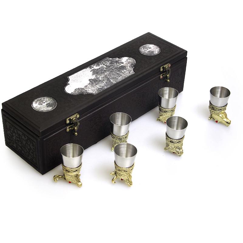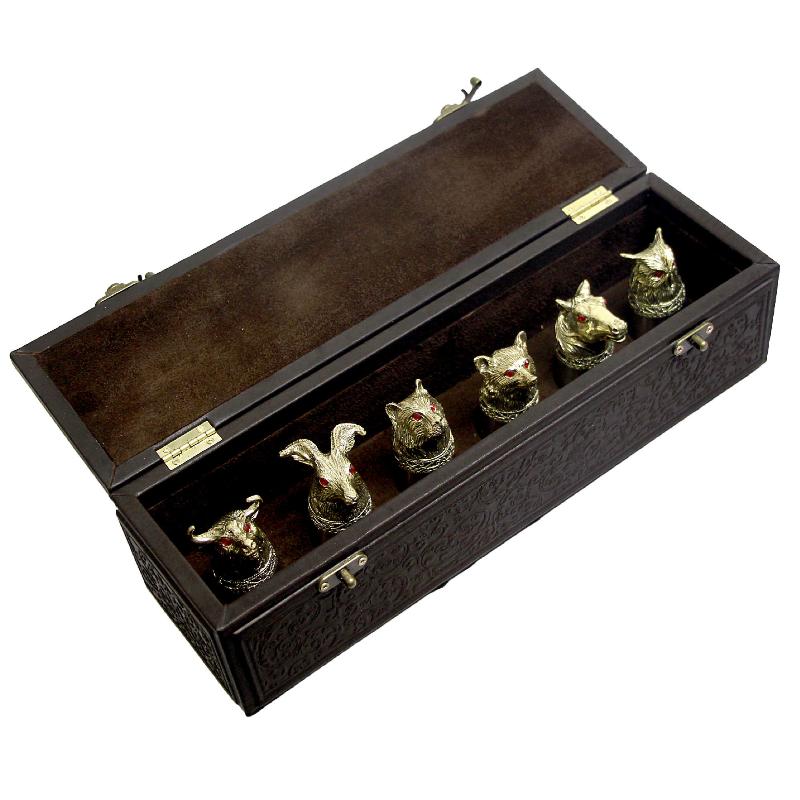 Подарочный набор Мужской характер состоит из шести стопок в виде голов животных, выполненных с восхищающим каждого профессионализмом и правдоподобием. Все это великолепие спрятано в футляр из телячьей кожи, где оно дожидается своего часа.