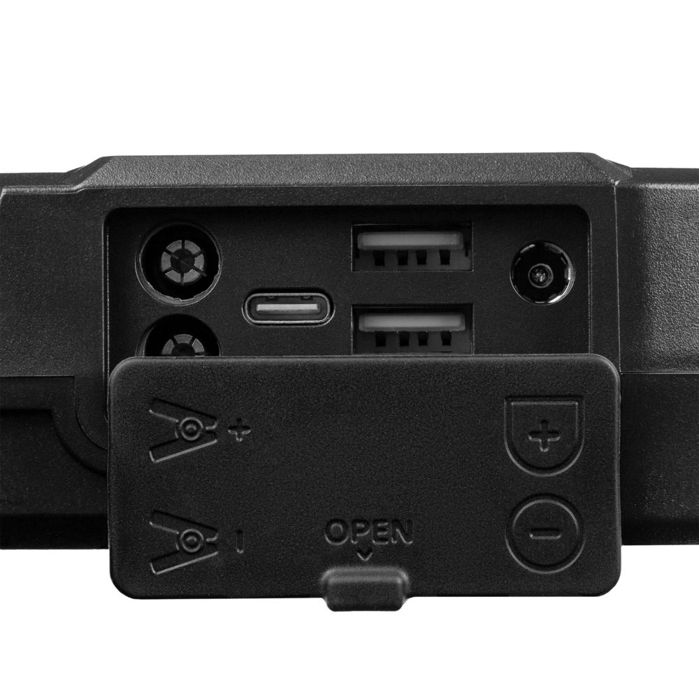 Разъемы USB и Type-C на корпусе поддерживают быструю зарядку переферийных устройств с поддержкой протокола быстрой зарядки QC. Встроенный фонарь в торце имеет 3 режима работы: обычный, стробоскоп и SOS — и точно выручит во время работы в темноте.