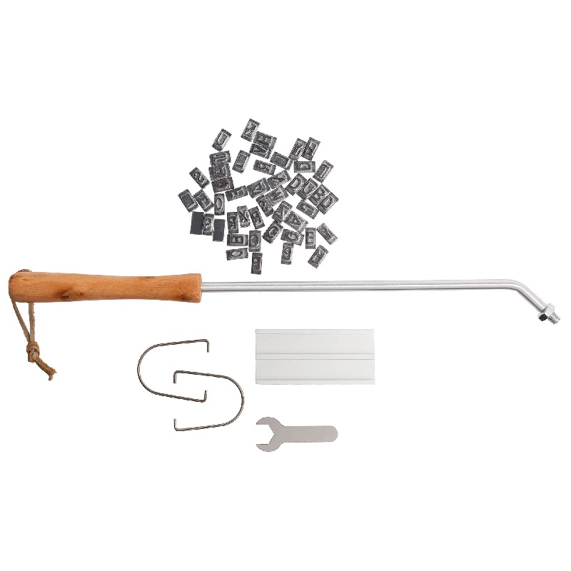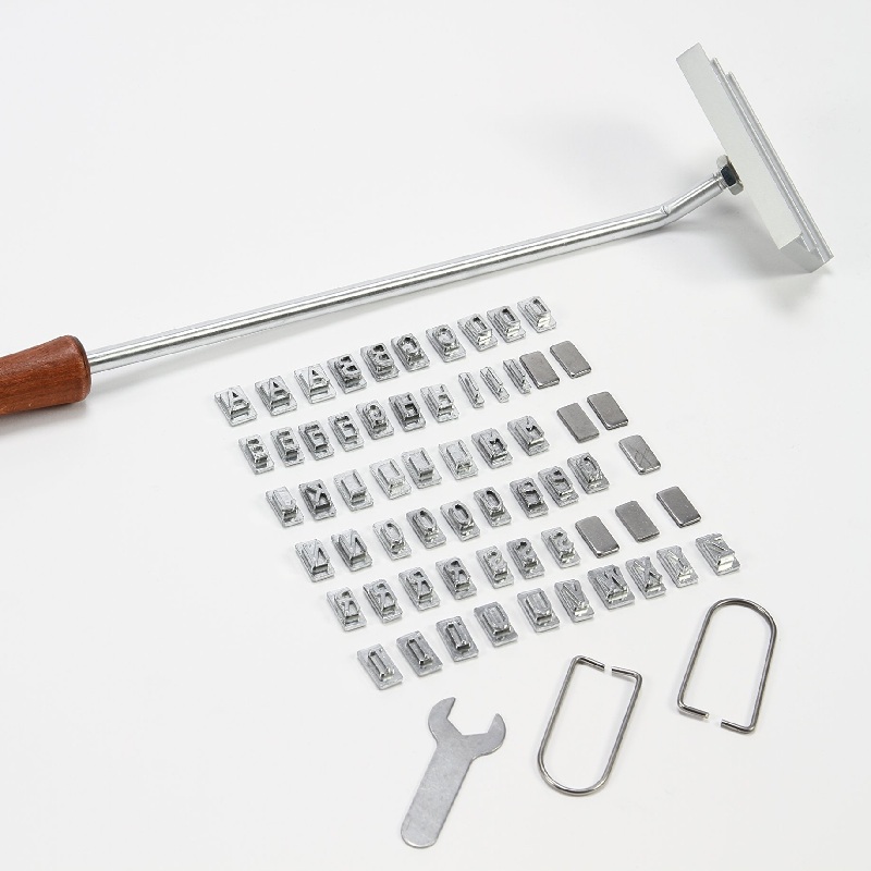 Комплект клеймо-основа с ручкой, 2 фиксатора, гаечный ключ, 61 металлический символ (буквы латинского алфавита)