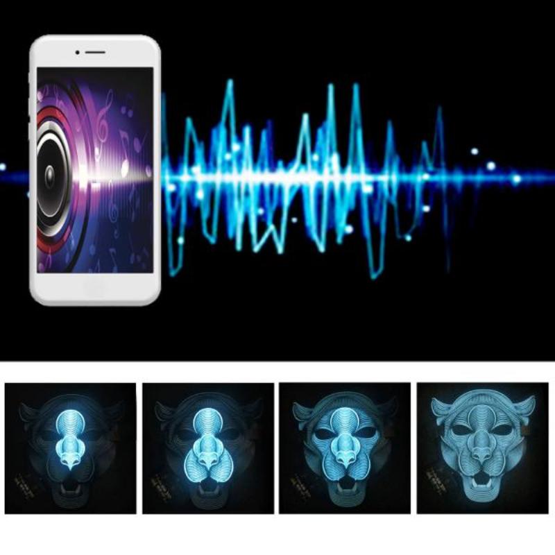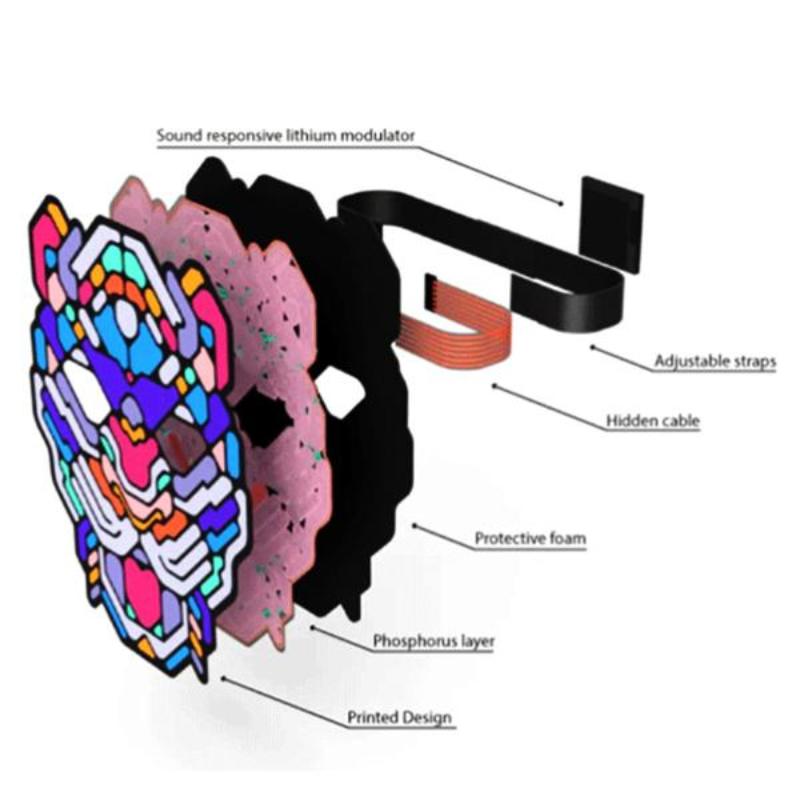 Особенности светодиодная маска состоит из фосфорных чернил, материал потребляющий минимальную мощность, холодный на ощупь и излучающий привлекательное свечение. Модуль маски преобразует звуковые волны в запрограммированный рисунок, излучающий чистый органический свет.