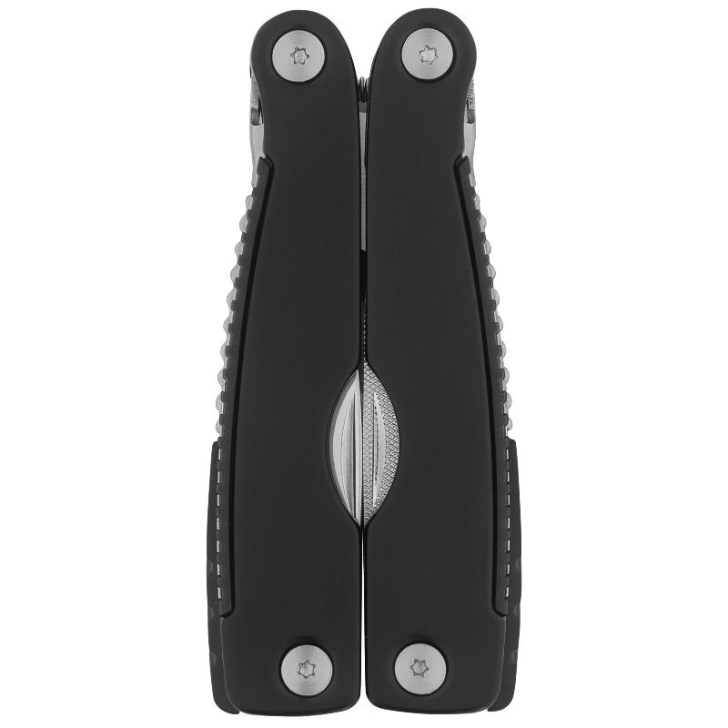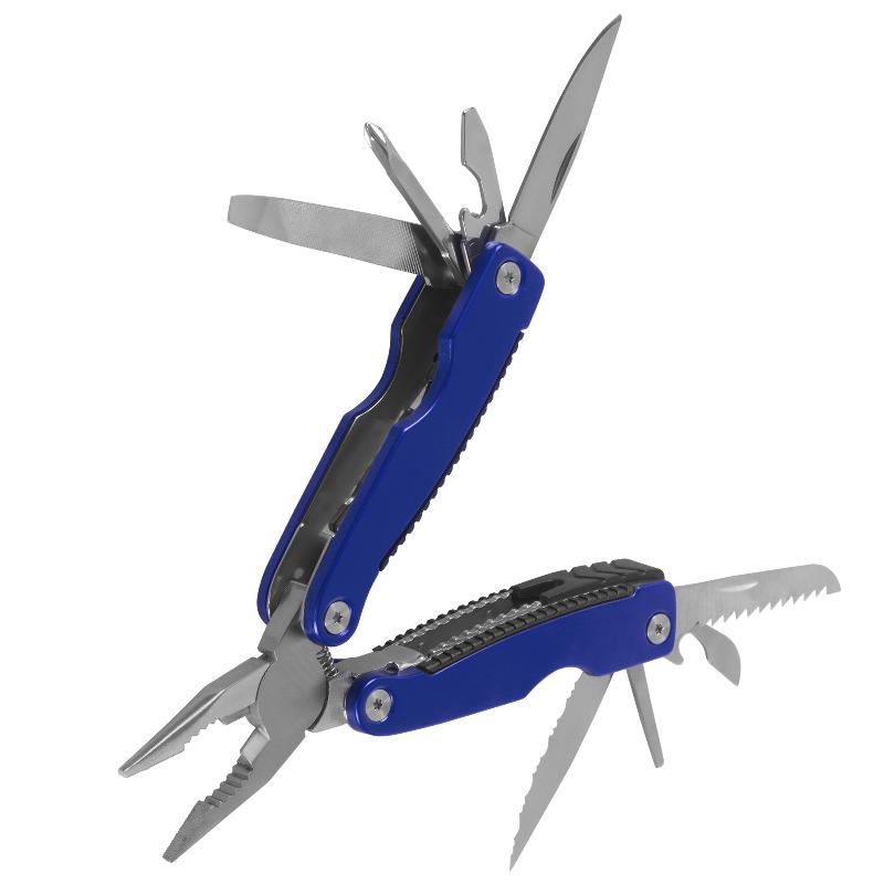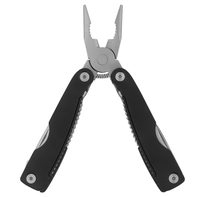 • 11 функций: Плоскогубцы, Кусачки, Консервный нож, Открывалка для бутылок, Средняя и маленькая плоские отвертки, Крестовая отвертка, Гладкое лезвие, Зубчатое лезвие, Пила, Напильник
