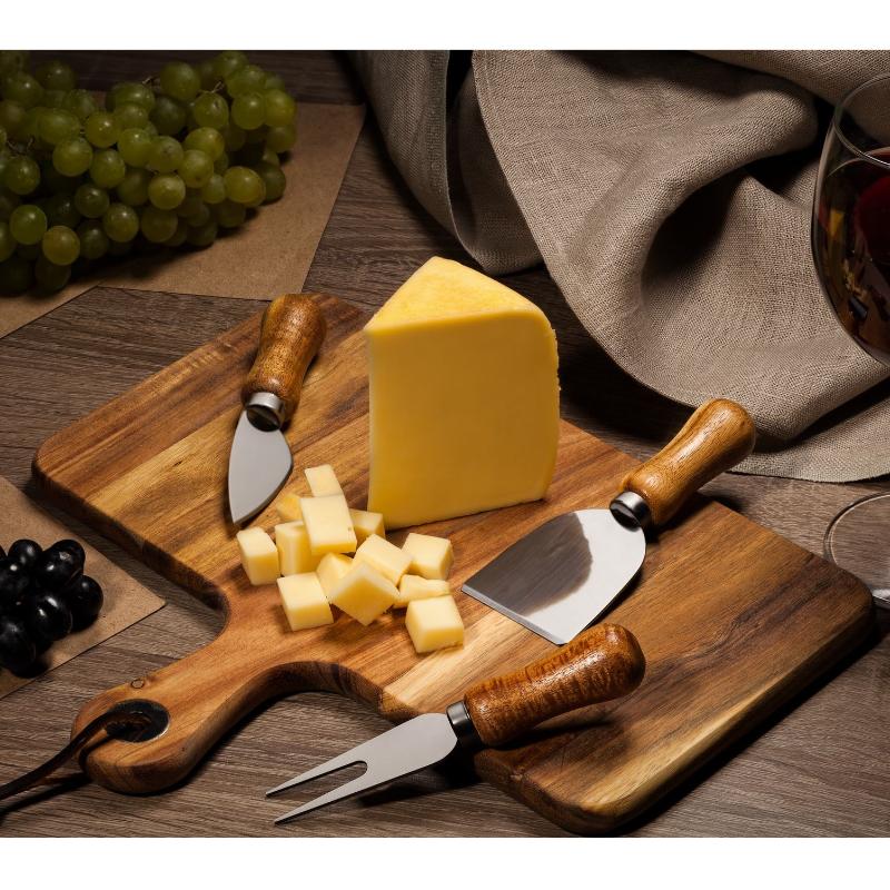 В наборе разделочная доска, вилка для сыра, нож-лопатка для мягкого сыра, листовидный нож для твердого сыра