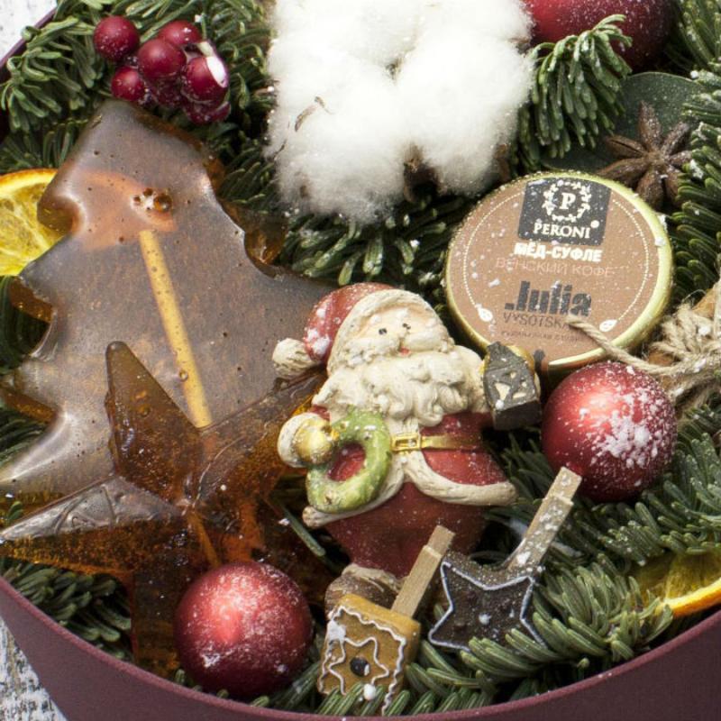 Состав мед-суфле, шишки, игрушка, новогодние прищепки 2шт., шарики, хлопок, леденец.