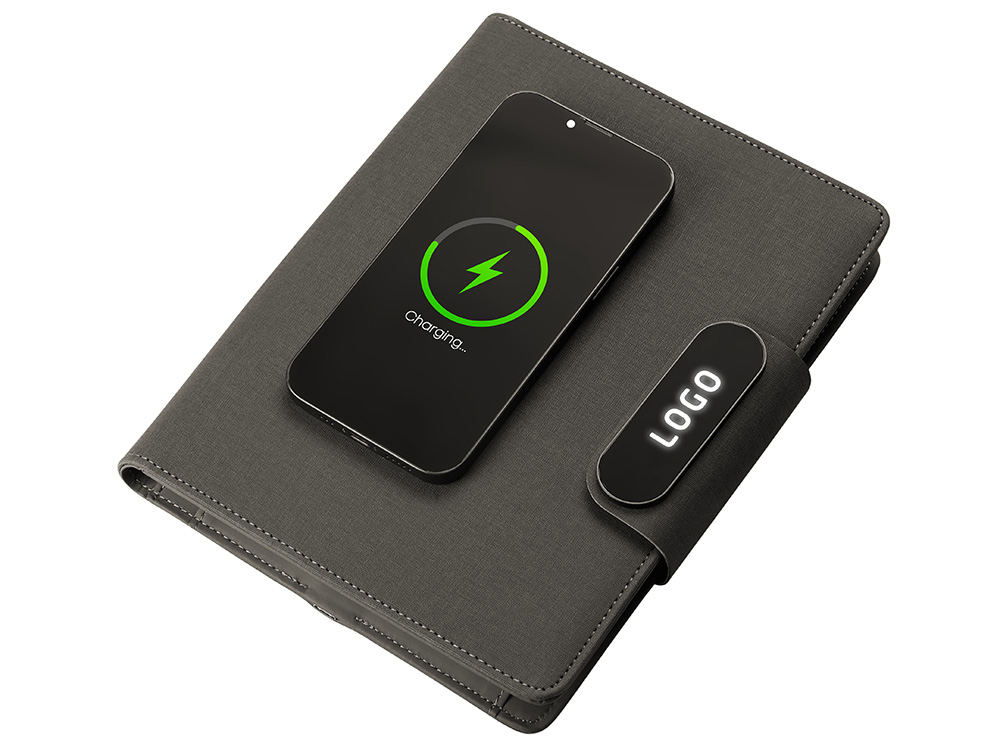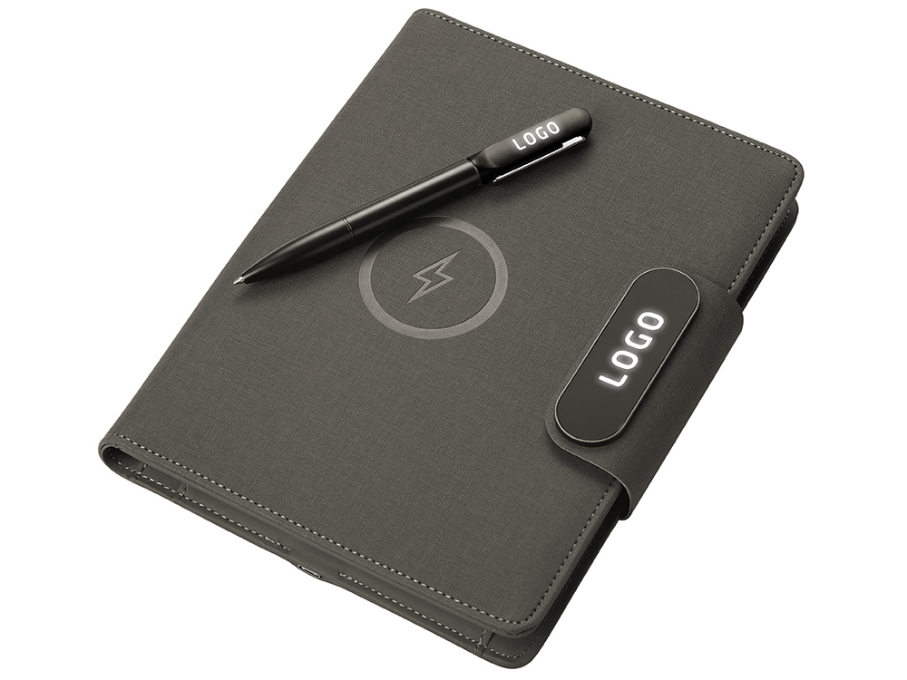Подарочный набор Twilight — стильный и современный бизнес-подарок, который в полной мере воплощает идею многофункциональности. Он состоит из органайзера формата А5, с помощью которого можно заряжать гаджеты как беспроводным способом, так и через кабель, фиксировать телефон для просмотра видео или проведения конференций, хранить ручку и делать записи, а также самой металлической ручки. Клапан органайзера и в верхняя часть ручки светятся при гравировке логотипа, что делает набор стильным, а лого более ярким и заметным. Практичный и технологичный аксессуар, который в состоянии заменить сразу несколько вещей. - Встроенный пауэрбанк емкостью 5000 мАh. - Возможность зарядки как беспроводным способом, так и через кабель. - Удобная магнитная застежка. - Качественные материалы. - Подставка для телефона. - Блокнот для записей 64 л. - Светящийся при гравировке логотип.
