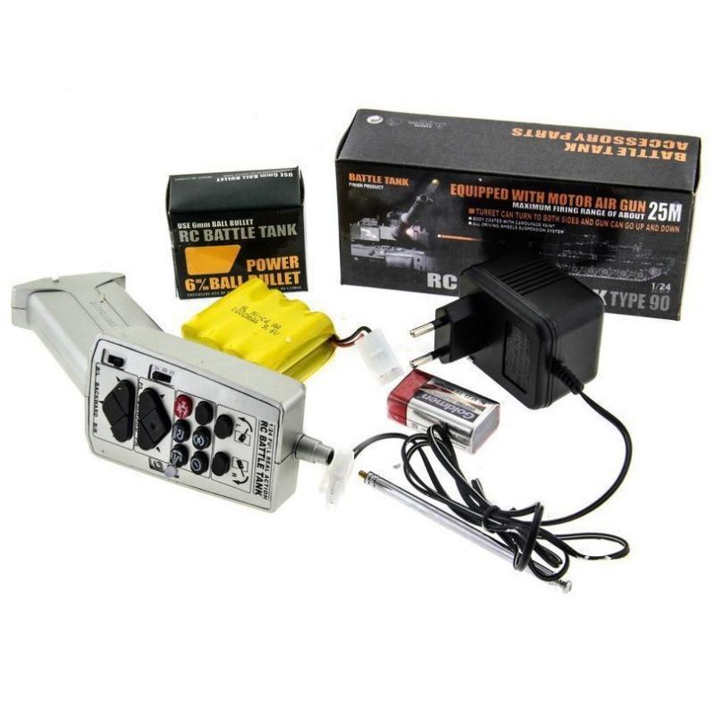 В комплекте модель танка, пульт дистанционного управления, аккумулятор в танк Ni-Cd 9.6V 1000 mAh, зарядное устройство для аккумулятора