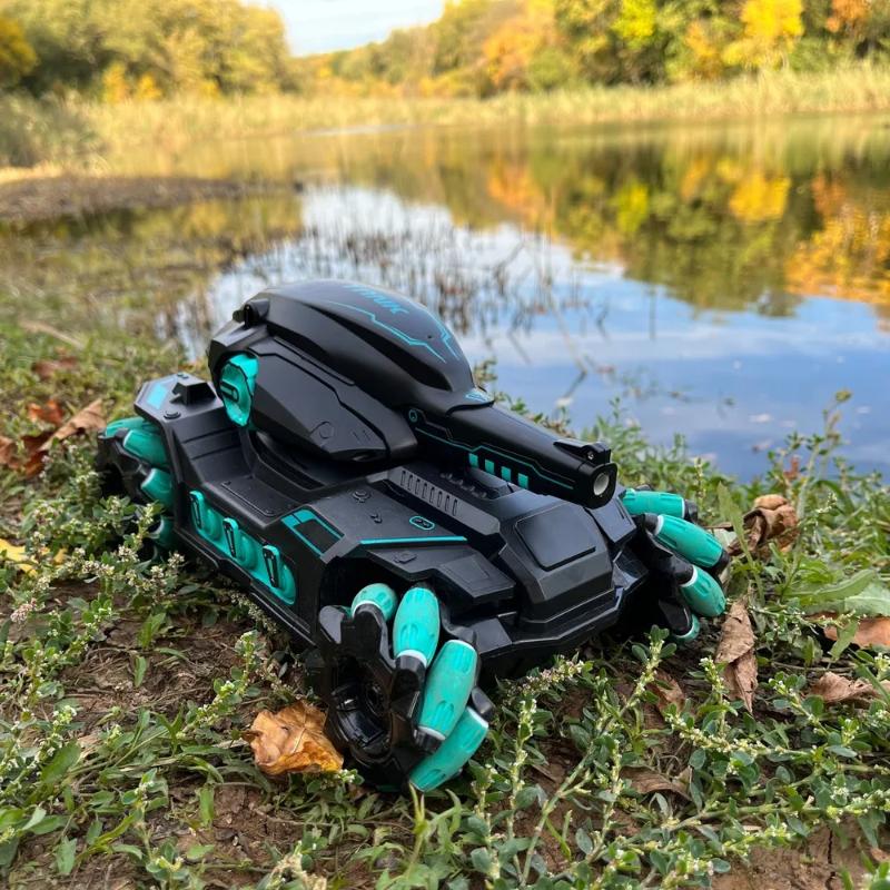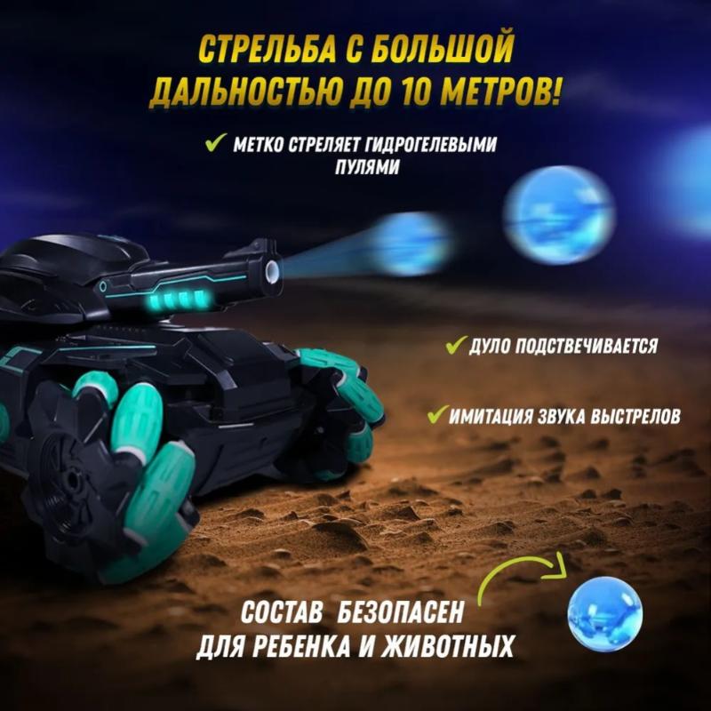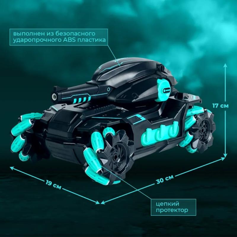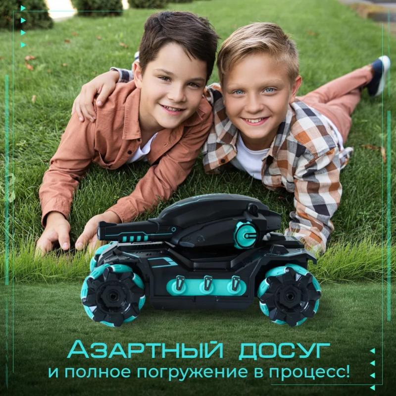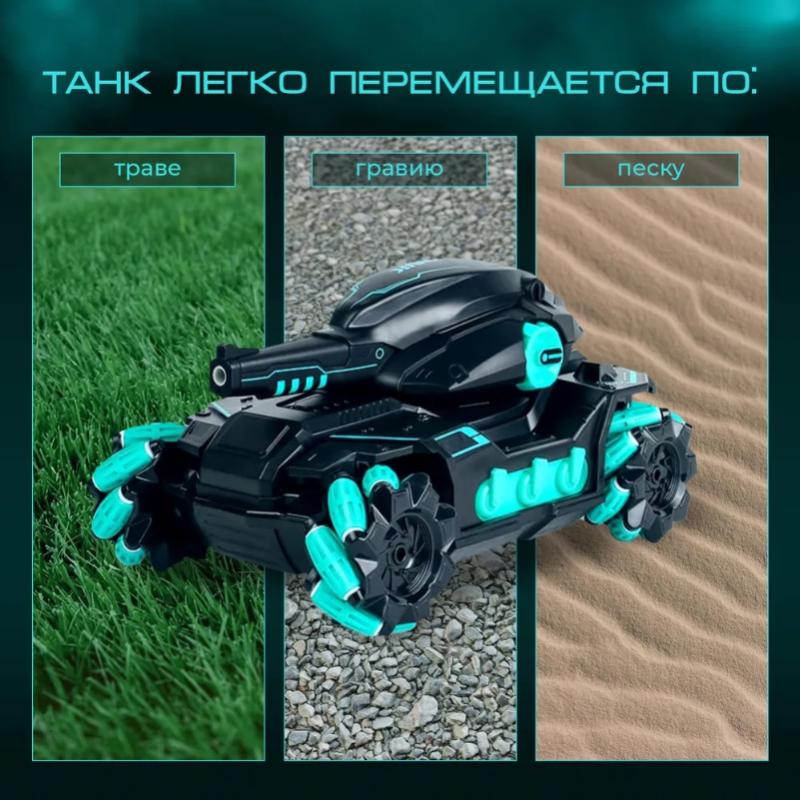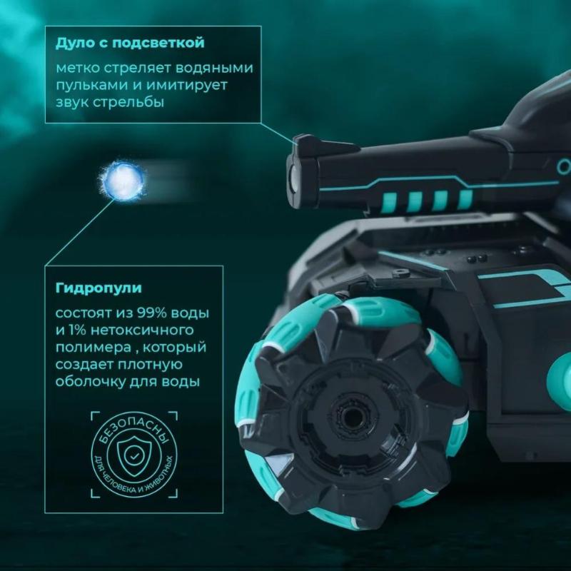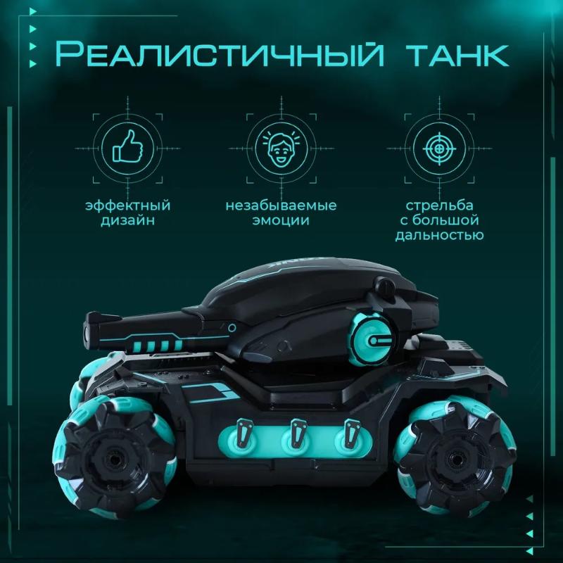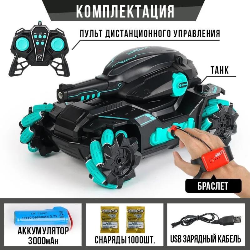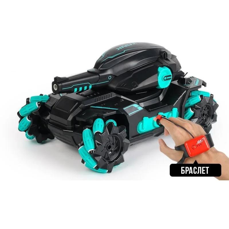 • Управлять танком можно двумя способами - пульт ДУ и рукой (ручной браслет для управления жестами), при таком управлении Танк игрушка с пульками двигается при изменении положения руки
